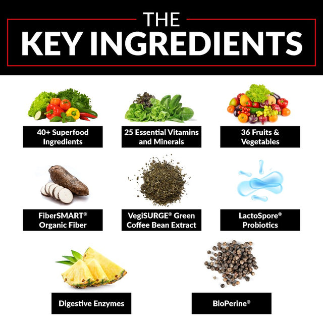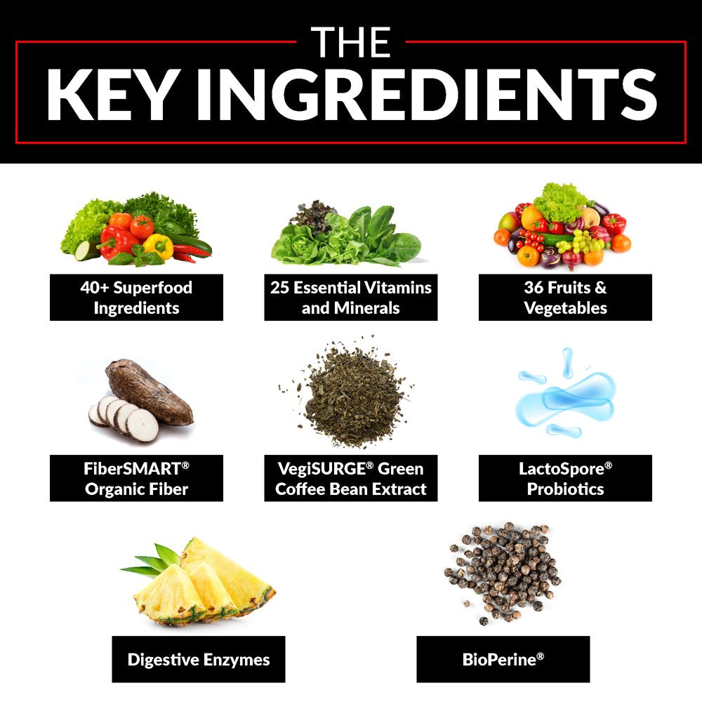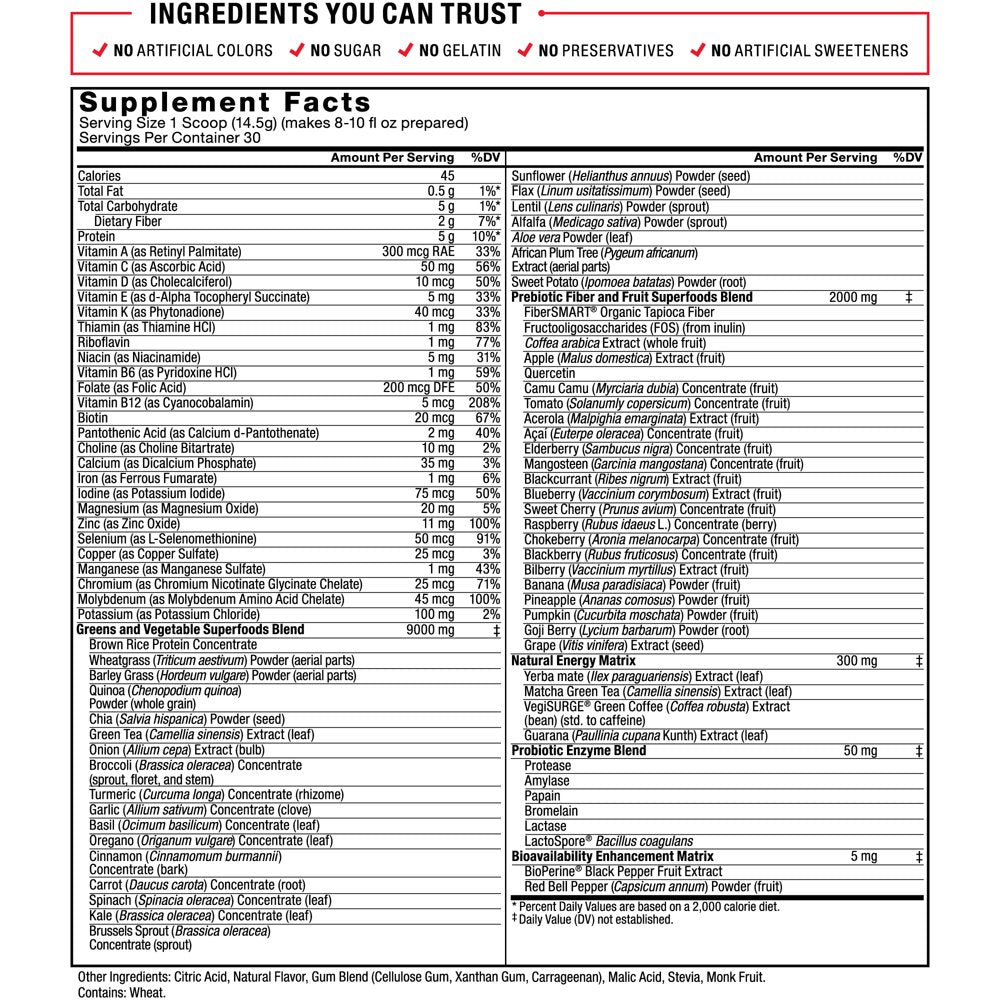 Vitamin A (as Retinyl Palmitate), Vitamin C (as Ascorbic Acid), Vitamin D (as Cholecalciferol), Vitamin E (as d-Alpha Tocopheryl Succinate), Vitamin K (as Phytonadione), Thiamin (as Thiamine HCl), Riboflavin, Niacin (as Niacinamide), Vitamin B6 (as Pyridoxine HCl), Folate (as Folic Acid), Vitamin B12 (as Cyanocobalamin), Biotin, Pantothenic Acid (as Calcium d-Pantothenate), Choline (as Choline Bitartrate), Calcium (as Dicalcium Phosphate), Iron (as Ferrous Fumarate), Iodine (as Potassium Iodide), Magnesium (as Magnesium Oxide), Zinc (as Zinc Oxide), Selenium (as L-Selenomethionine), Copper (as Copper Sulfate), Manganese (as Manganese Sulfate), Chromium (as Chromium Nicotinate Glycinate Chelate), Molybdenum (as Molybdenum Amino Acid Chelate), Potassium (as Potassium Chloride), Greens and Vegetable Superfoods Blend: Brown Rice Protein Concentrate, Wheatgrass (Triticum aestivum) Powder (aerial parts), Barley Grass (Hordeum vulgare) Powder (aerial parts), Quinoa (Chenopodium quinoa) Powder (whole grain), Chia (Sativa hispanica) Powder (seed), Green Tea (Camellia sinensis) Extract (leaf), Onion (Allium cepa) Extract (bulb), Broccoli (Brassica oleracea) Concentrate (sprout, floret, and stem), Turmeric (Curcuma longa) Concentrate (rhizome), Garlic (Allium sativum) Concentrate (clove), Basil (Ocimum basilicum) Concentrate (leaf), Oregano (Origanum vulgare) Concentrate (leaf), Cinnamon (Cinnamomum burmannii) Concentrate (bark), Carrot (Daucus carota) Concentrate (root), Spinach (Spinacia oleracea) Concentrate (leaf), Kale (Brassica oleracea) Concentrate (leaf), Brussels Sprout (Brassica oleracea) Concentrate (sprout), Sunflower (Helianthus annuus) Powder (seed), Flax (Linum usitatissimum) Powder (seed), Lentil (Lens culinaris) Powder (sprout), Alfalfa (Medicago sativa) Powder (sprout), Aloe vera Powder (leaf), African Plum Tree (Pygeum africanum) Extract (aerial parts), Sweet Potato (Ipomoea batatas) Powder (root), Prebiotic Fiber and Fruit Superfoods Blend: FiberSMART Tapioca Fiber, Fructooligosaccharides (FOS) (from inulin), Coffea arabica Extract (whole fruit), Apple (Malus domestica) Extract (fruit), Quercetin, Camu Camu (Myrciaria dubia) Concentrate (fruit), Tomato (Solanumly copersicum) Concentrate (fruit), Acerola (Malpighia emarginata) Extract (fruit), Açaí (Euterpe oleracea) Concentrate (fruit), Elderberry (Sambucus nigra) Concentrate (fruit), Mangosteen (Garcinia mangostana) Concentrate (fruit), Blackcurrant (Ribes nigrum) Extract (fruit), Blueberry (Vaccinium corymbosum) Extract (fruit) Sweet Cherry (Prunus avium) Concentrate (fruit), Raspberry (Rubus idaeus L.) Concentrate (berry), Chokeberry (Aronia melanocarpa) Concentrate (fruit), Blackberry (Rubus fruticosus) Concentrate (fruit), Bilberry (Vaccinium myrtillus) Extract (fruit), Banana (Musa paradisiaca) Powder (fruit), Pineapple (Ananas comosus) Powder (fruit), Pumpkin (Cucurbita moschata) Powder (fruit), Goji Berry (Lycium barbarum) Powder (root), Grape (Vitis vinifera) Extract (seed), Natural Energy Matrix: Yerba mate (Ilex paraguariensis) Extract (leaf), Matcha Green Tea (Camellia sinensis) Extract (leaf), VegiSURGE Green Coffee (Coffea robusta) Extract (bean) (std. to caffeine), Guarana (Paullinia cupana Kunth) Extract (leaf), Probiotic Enzyme Blend: Protease, Amylase, Papain, Bromelain, Lactase, LactoSpore Bacillus coagulans, Bioavailability Enhancement Matrix: BioPerine Black Pepper Fruit Extract, Red Bell Pepper (Capsicum annum) Powder (fruit)./div>