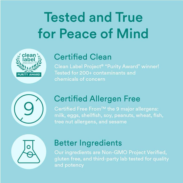 - Vegetarian. Gluten-free. Gelatin-free. No milk, eggs, shellfish, soy, peanuts, wheat, fish and tree nut allergens. No refrigeration required. Third-party lab tested for purity and potency