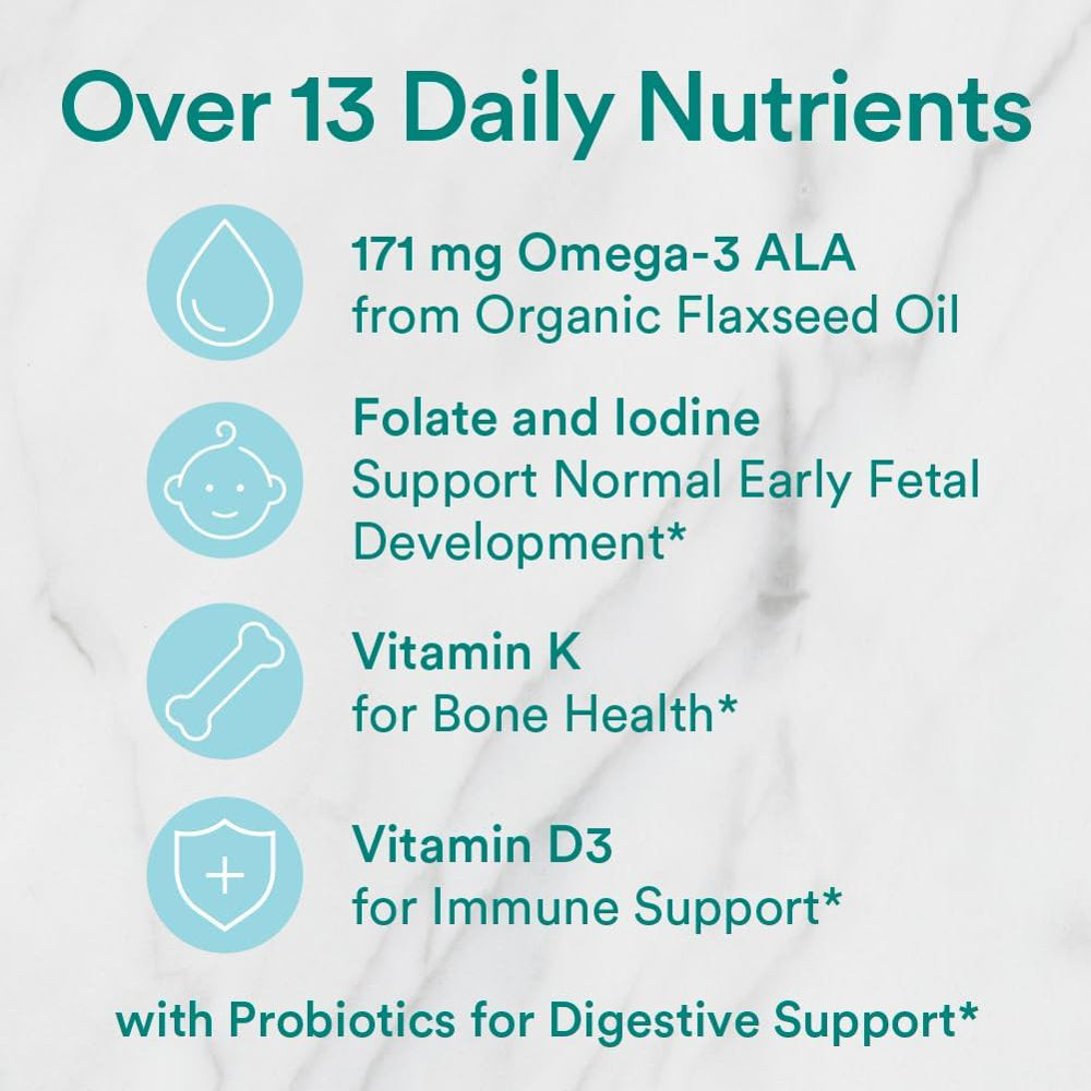 - Organic prenatal vitamins include 15 essential nutrients: omega-3 ALA (from flaxseed oil), vitamin D3 for bone health, & probiotics for digestion
