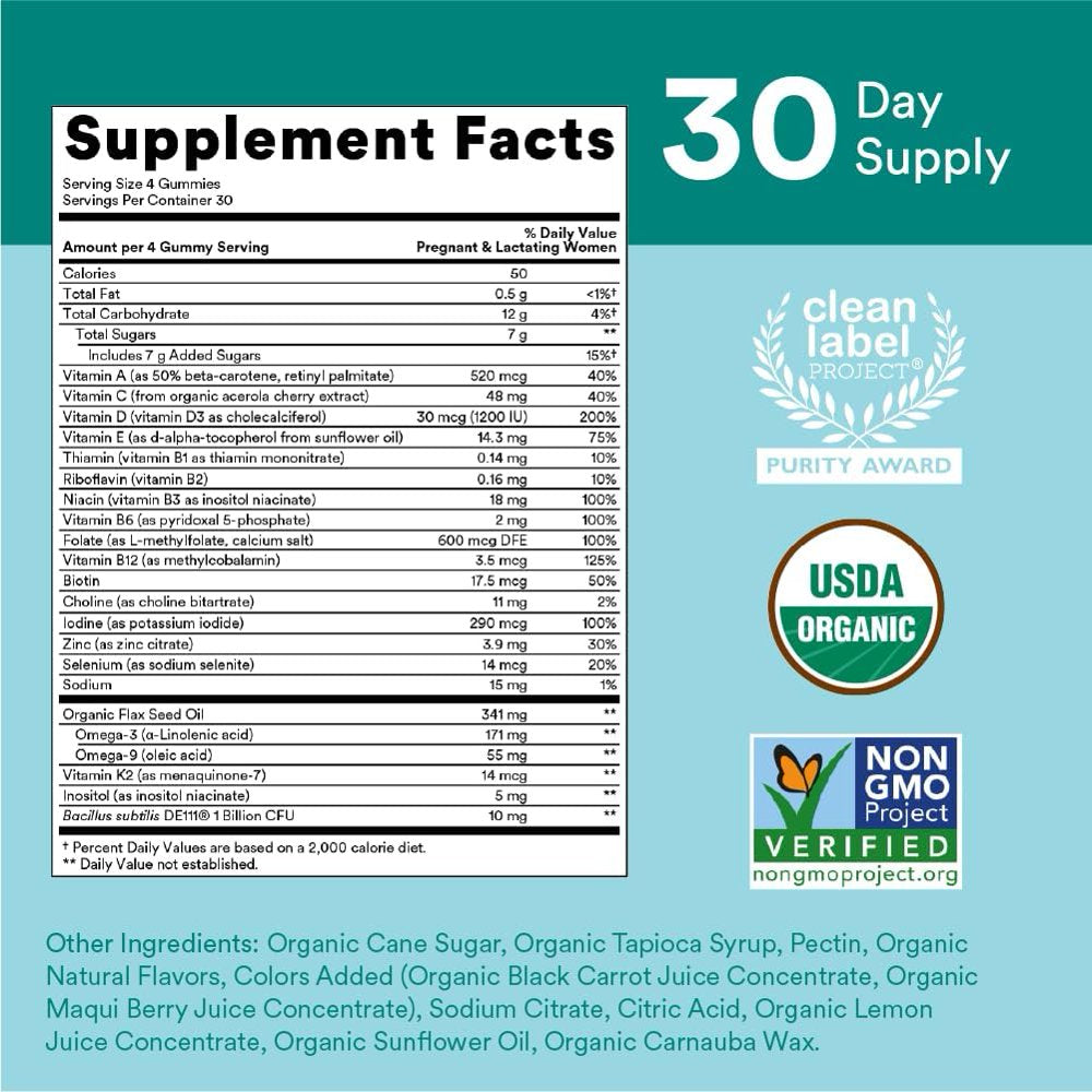 SmartyPants Organics Prenatal Complete is a certified-organic and certified-vegetarian multifunctional dietary supplement formulated just for moms-to-be. While you re waiting to meet your new bundle of joy, we have our own special delivery -our gummy. We carefully select the most premium and organic ingredients and pack them into one delicious gummy tailored just for you and your little one on the way.Each serving delivers a robust blend of omega-3 sourced from organic flax seed oil, probiotics,* and 16 essential nutrients, including folate as methylfolate to support normal early fetal development,* B-vitamins to support energy,* vitamin D as D3 to support bone health,* and zinc to promote healthy immune function* all in one. Each serving is also an excellent source of vitamins A, C, E, B6, B12, niacin, biotin, pantothenic acid, iodine, zinc, and selenium.
