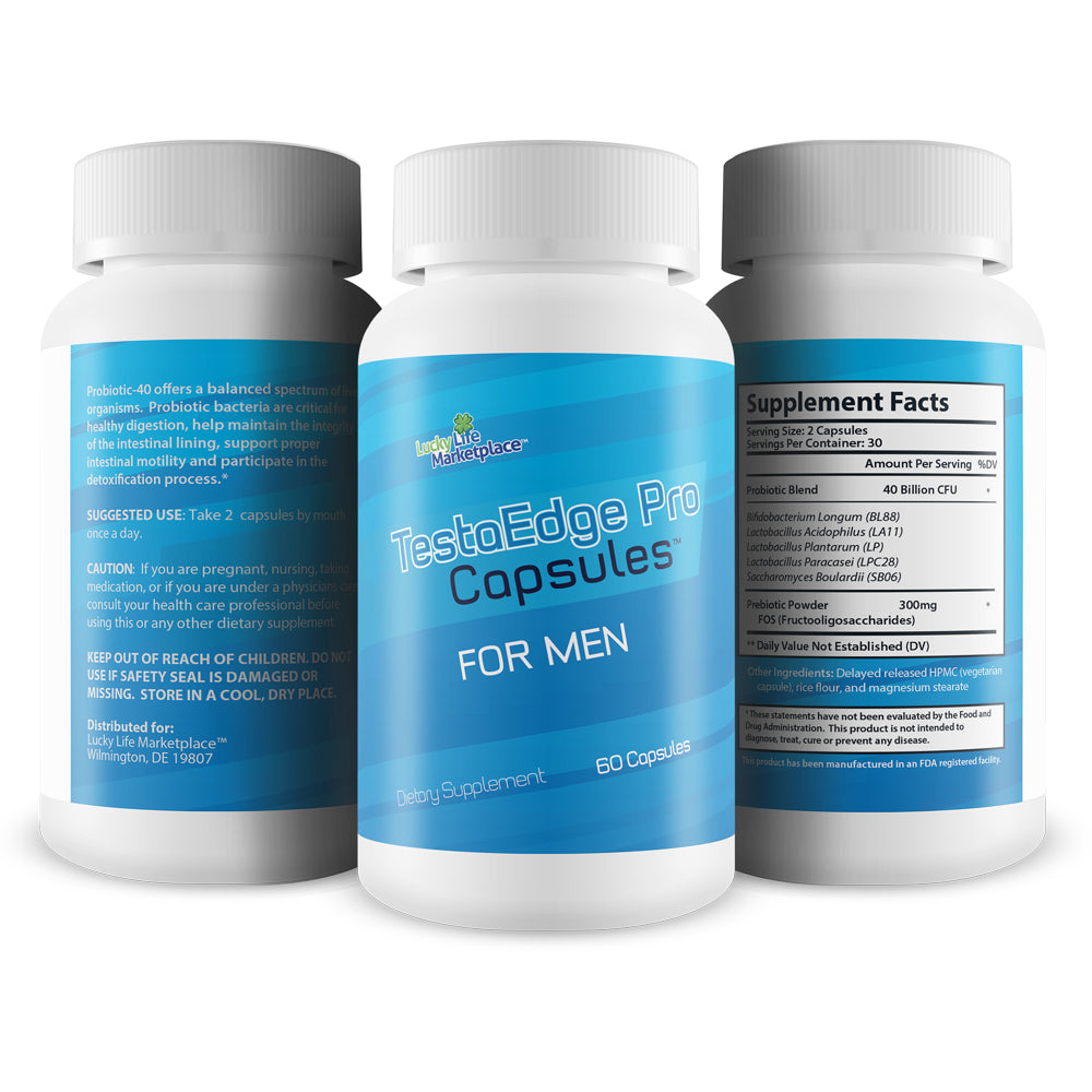 TestaEdge Pro Capsules is a male probiotic blend to support men’s health. Health starts in the gut and when our gut becomes unbalanced it can have many negative effects on the body and how it functions. This premium male probiotic formula contains 40 Billion CFU’s of probiotics and prebiotics to support a healthy male body and its functions.