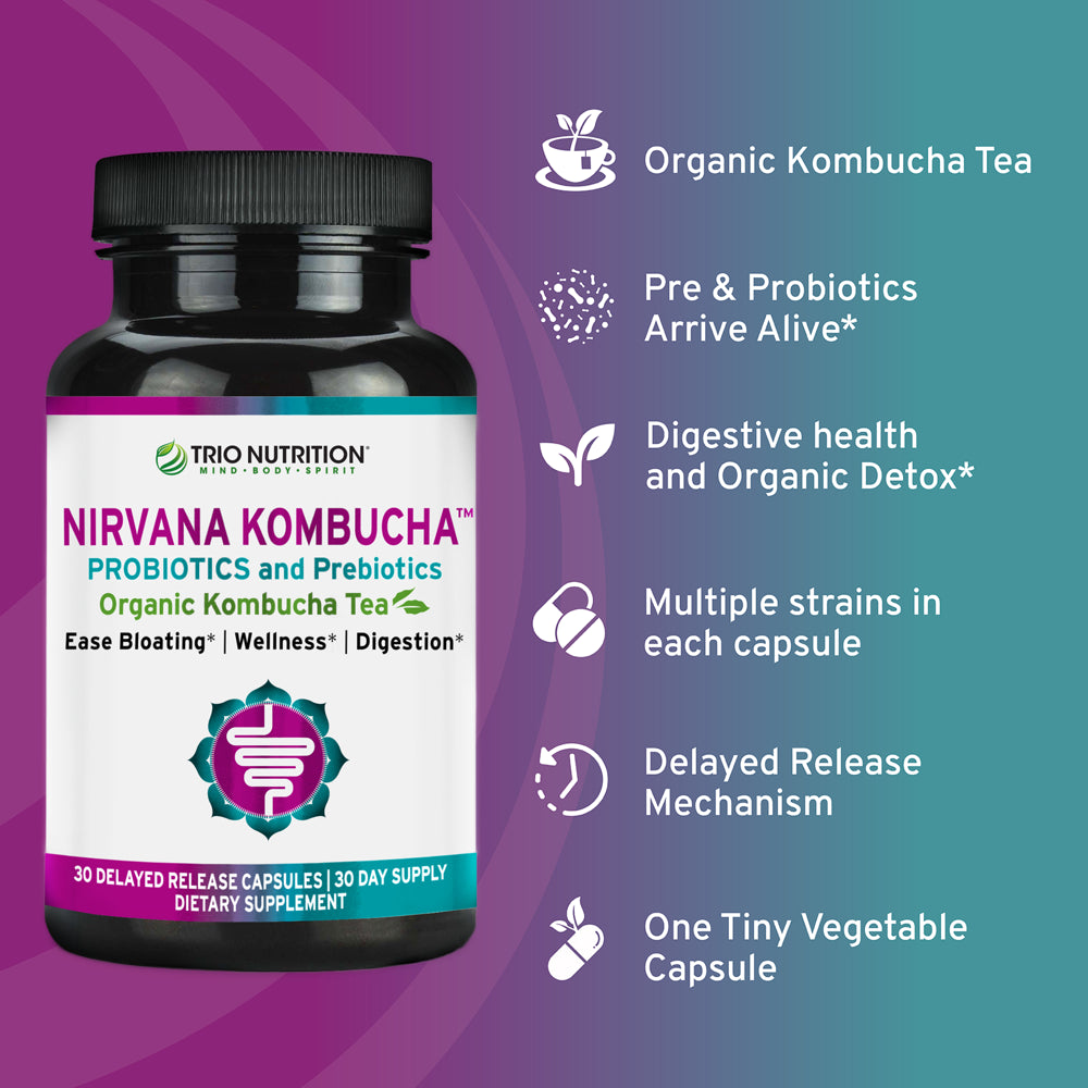 Nirvana Kombucha by Trio Nutrition is the world's first prebiotic and probiotic proprietary blend to contain organic kombucha tea. Our digestive enzymes are delivered through delayed-release veggie capsules, so you can get the maximum benefit from every dose. This layering protects the live cultures on their journey to the small intestine, maximizing survivability and effectiveness. This keto-friendly digestive health supplement helps support digestion, immune health, vitality, and overall wellness in a convenient capsule.
