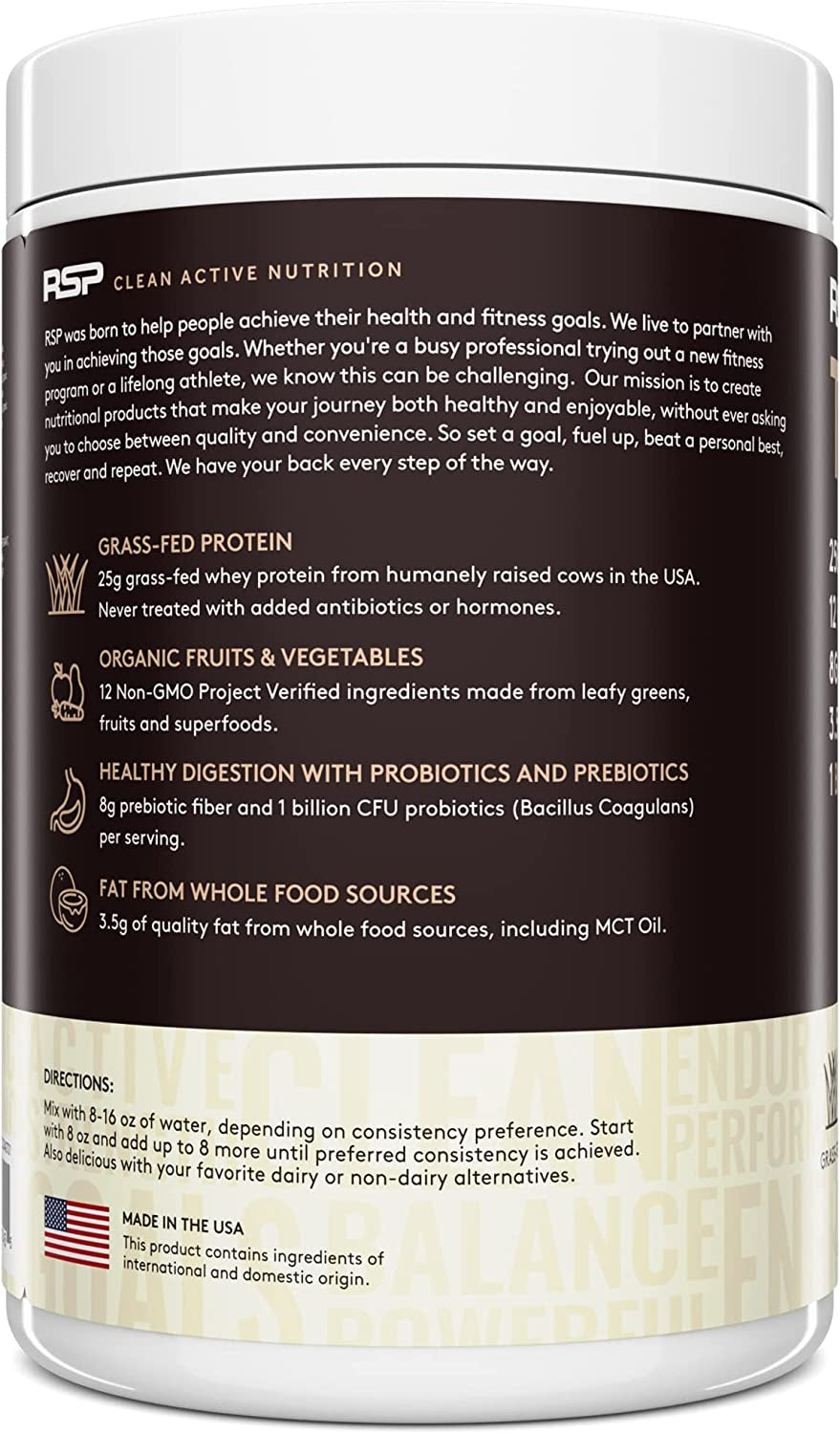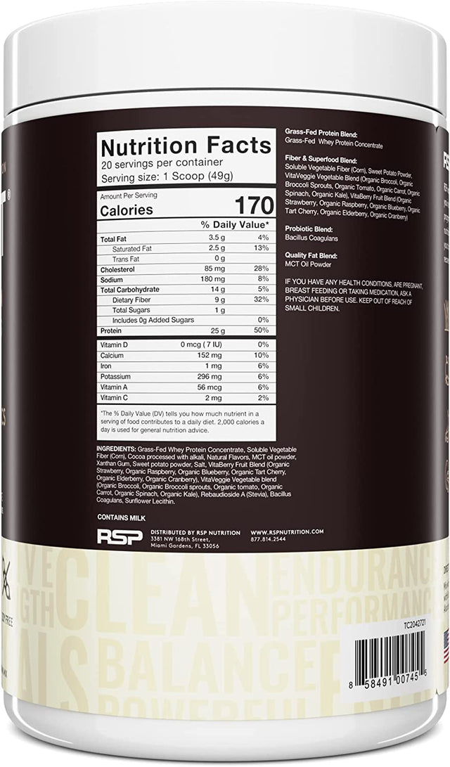- Premium Grass Fed Whey Protein β 25g of ultra premium, grass fed whey protein that is sourced from farms in the USA, never treated with added antibiotics or hormones and naturally contains a complete amino acids profile.