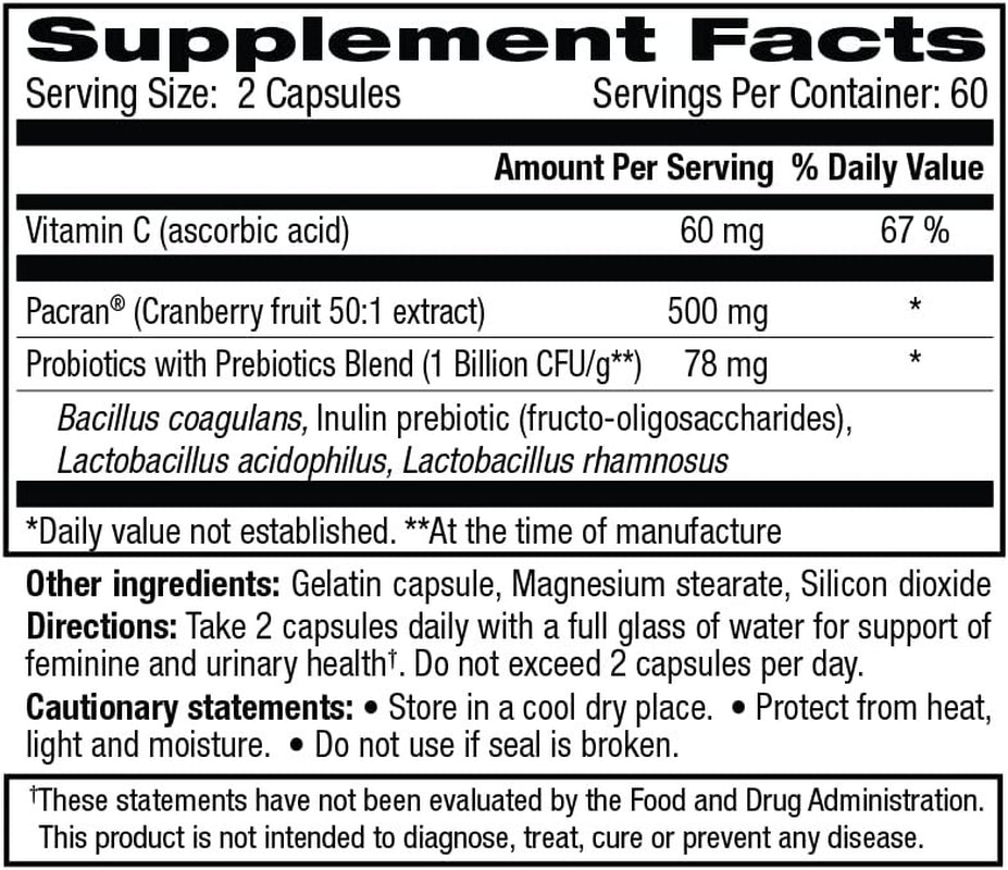 - Women's probiotics for vaginal health and probiotic for urinary tract health contain probiotics, fructo-oligosaccharides (prebiotics), and natural cranberry powder