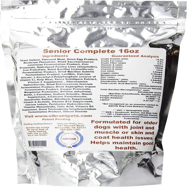 Vibrant Pets Senior Complete Dog Immune System Supplement | Nutrient-Rich Muscle, Joint, Skin & Coat Powder With this one-of-a-kind, aged dog immune booster supplement, all problems that are making huge problems to your dog will go away. The premium high-quality supplements from Vibrant Pets are here with another edition, this time with a specially crafted dog supplement for elderly dogs! How to Use? One of the best things about the Senior Complete is in its effectiveness and simplicity. Just sprinkle the dog supplement powder every day on your food. It quickly disappears and it is effectively digested by your dog. No refrigeration is needed! Instant Effect and Improvements! After just a few uses, your dogâs digestion problems will disappear, the skin and coat will be glossy, energy levels will go up. The overall health will be significantly improved as Senior Complete is a versatile, all-in-one formula. Based on a powerful formula The effectiveness and quality of this formula come from its nutrition-rich ingredients like proteins, zinc, vitamins, probiotics, enzymes, iron, glucosamine and more. This guarantees that this dog immune system supplement will supply powerful health and immune enhancement. Why Purchase Vibrant Pets Senior Complete? ï relief from body aches and pains ï overcome of allergies ï great immune support for dogs ï Increases performance and energy ï Improves digestions and reduces sensitive stomach issues ï Supports muscles and joints ï healthier skin, coat and hair Your dogâs glossy skin and coat increased energy level, and improved health are just one click away! Click âAdd to Cartâ and instantly improve the quality of life of your aging dog! Made in America by a disabled veteran owned Company
