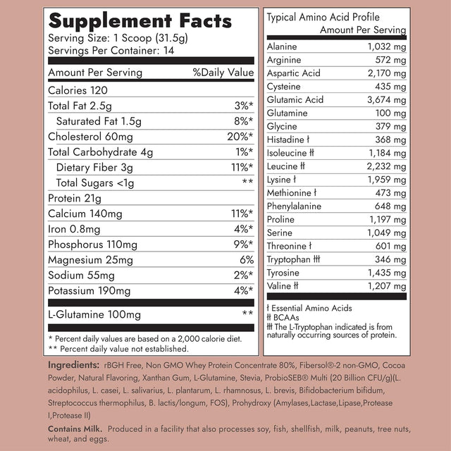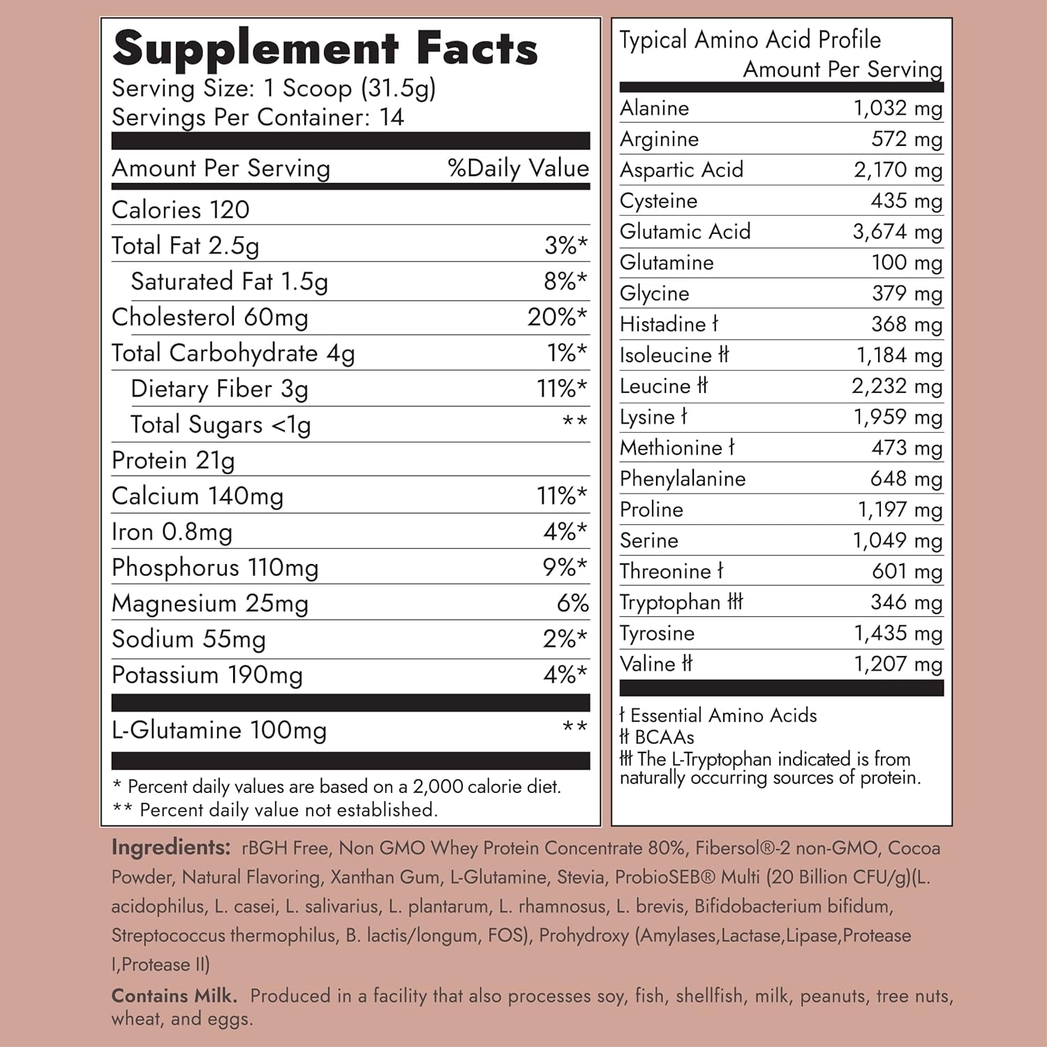 - FORMULA HIGHLIGHTS – Whey protein provides all 9 essential amino acids, and is high in BCAA’s. Easily digested with added Probiotics and 100mg of L-Glutamine.