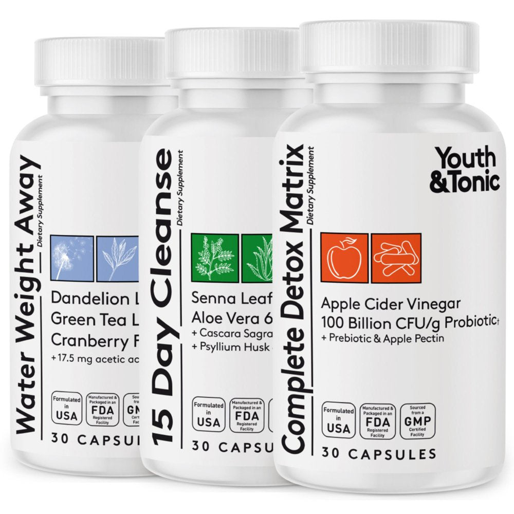 The Youth & Tonic 15 Day Cleanse, Complete Detox Matrix, and Water Weight Away program is designed for colon detox, body cleansing and weight loss. This unisex program aims to reduce bloating, achieve a flat stomach, and manage food cravings. This weight management supplement pills contains only natural ingredients, such as Senna, Dandelion Leaf, Chromium, Probiotics and are manufactured in the United States in an approved facility that adheres to all GMP standards. They have also undergone third-party testing to ensure purity and potency. Each package contains 3 products, 30 capsules each.