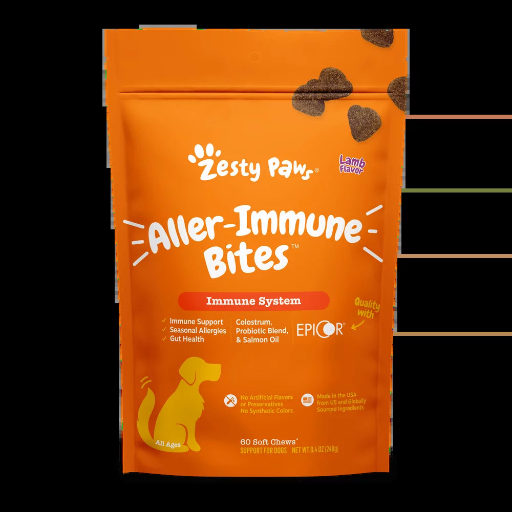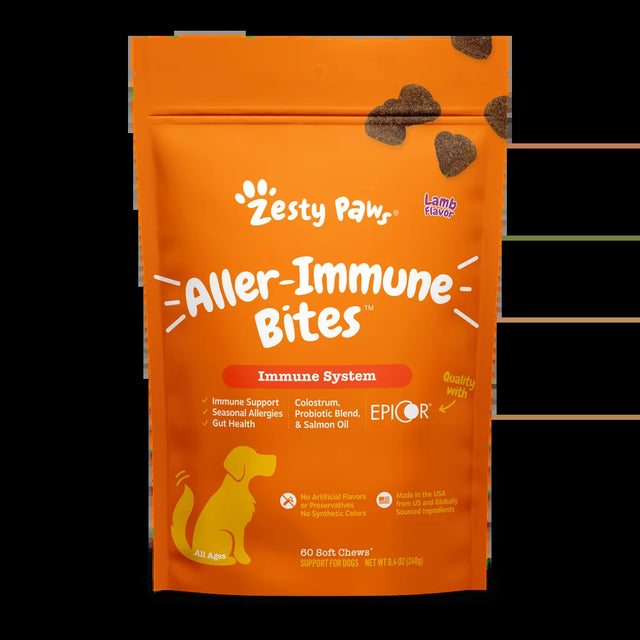 Zesty Paws Aller-Immune Bites for Dogs, Lamb Flavor, 60 Count. Zesty Paws Aller-Immune Bites are grain free soft chews that support immune, histamine, and digestive health for dogs with skin, seasonal, and environmental allergy issues. At 80 mg per chew, Epicor contains vitamins, protein, fiber, and antioxidants that are clinically proven to support the body's natural immune defenses to keep your dog healthy. These supplements feature a powerful Prebiotic and five strains of Probiotics for 250 million cfu of healthy bacteria that supports pet digestion and immune health. Each chew contains Salmon Fish Oil to provide Omega 3 fatty acids epa & dha that provide skin and immune support for dogs with allergies that cause itching and hot spots. These chewables contain Colostrum, a pre milk that helps with allergies, immune function, and digestion, plus Apple Cider Vinegar and Organic Licorice Root for additional care.