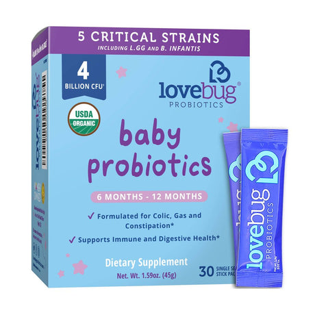 Lovebug Probiotics Award Winning USDA Organic Probiotic for Babies, 6-12 Months, 30 Packets