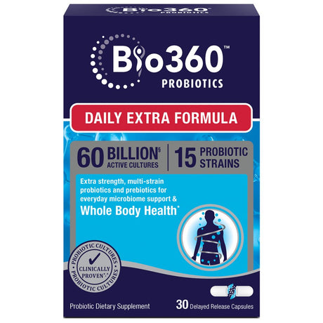 Bio360 Probiotics Daily Extra Formula, Vegan Prebiotics & Probiotics for Extra Support, 30 Ct