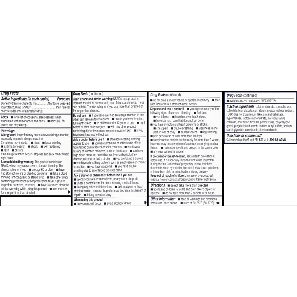 - Take two ibuprofen PM caplets at bedtime for occasional sleeplessness related to minor aches and pains
