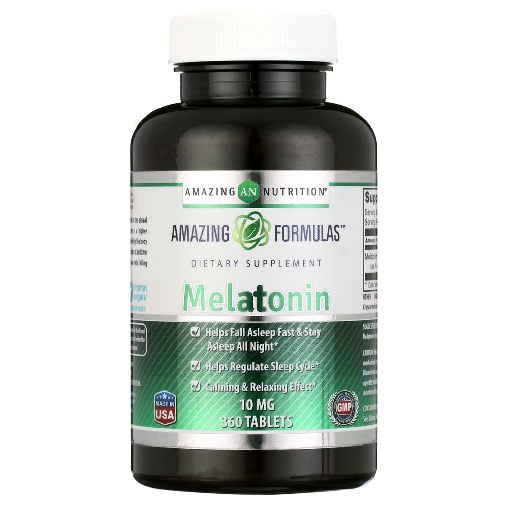 AMAZING FORMULAS MELATONIN 10 MG Sleep is vital to yourwell-being, and your body is designed to follow the rhythms of an internalclock to allow you to sleep when night arrives. Melatonin plays an importantrole in keeping this natural clock ticking. Studies suggest that by increasingthe levels of melatonin in the body, you may be able to get more restfulnight's sleep. Each tablet on Amazing Formulas Melatonin give an optimumdosage of 10mg melatonin making this an effective all-natural sleep aidsupplement. The benefits of Melatonin sleep support may help individualssuffering from: Temporary sleeplessness due to stress, long distance travelsand other factors Poor sleep due to waking up frequently during the night Age-related sleep problems WHAT IS MELATONIN? Produced by the pineal gland inthe brain, melatonin is a naturally-occurring hormone present in your bodythroughout the day with levels becoming higher and higher as night approaches.The elevated levels of melatonin signal to your body that it's time to go tosleep, and the natural chemical helps you to rest more soundly through thenight. Because sleep and mood are closely connected, supplementing withmelatonin can alleviate stress. Very small amounts of melatonin are found infoods such as meats, grains, fruits, and vegetables but supplementing is muchmore effective. HELPS FALL ASLEEP Studies suggest that by increasing thelevels of melatonin in the body, you can get more restful night's sleep.Melatonin may help an individual fall asleep more swiftly and stay asleep allnight long by helping build the levels of melatonin already present in thebrain. REGULATE SLEEP CYCLE Blood levels of the pineal hormone melatonin arehigh at night and low during the day. The elevated levels of melatonin signalyour body that it's time to go to sleep. Taking Melatonin supplement atbedtime has both a sleep-inducing effect and an ability to entrain the sleep-wake rhythm. Sleep cycle may become more restful and complete with lesswakefulness. Melatonin may help with jet lag and delayed sleep phase syndrometo regulate sleep cycle. CALMING AND RELAXATION EFFECT ON THE BODY Melatoninmay help reduce anxiety and stress with its calming and relaxing properties.This in turn can help an individual stay calm and thus supports mentalrelaxation. Melatonin also supports healthy brain function and promotes morealertness during day time Read more We believe that balanced Nutrition is thekey for Healthy Living. We are passionate about bringing you the finestselection of products which can perfectly complement a healthy diet and activelifestyle. We are constantly expanding our line-up of formulas to be a one-stop shop for all your health and wellness needs. OUR MISSION & VALUES Webelieve nothing is more important than your health. Our goal is to get youliving well and feeling better and we want to make it easy! We understand thatgetting all the nutrients you need on a daily basis can be a difficult task.It can seem daunting to incorporate the recommended amount of fruits andvegetables, high-fiber, whole grains, healthy fats and lean protein into yourbusy day. Amazing Nutrition has all the best vitamins to help you get allright nutrients daily. OUR COMMITMENT We only use ingredients from suppliersthat meet our stringent standards. Additionally, every single product issubjected to countless quality tests to ensure purity and full potency. Allour products are made in USA at a GMP facility. Disclaimer: These statementshave not been evaluated by the Food and Drug Administration. This product isnot intended to diagnose, treat, cure, or prevent any disease