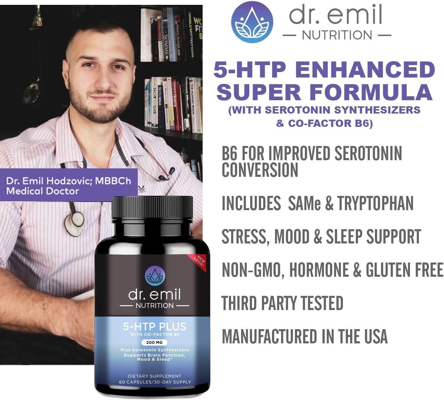 - Doctor-Derived Formula: Dr. Emil Hodzovic has painstakingly formulated our 200 MG 5-HTP Plus supplement with the highest quality ingredients that are gluten-free, non-GMO, and manufactured in a cGMP facility to ensures that each product is 100% free of hype, hormones, and empty promises.