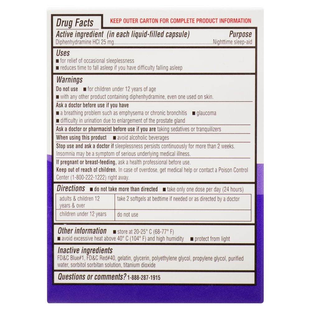 - Active ingredient (in each softgel): Diphenhydramine Hydrochloride 25 mg (nighttime sleep-aid)