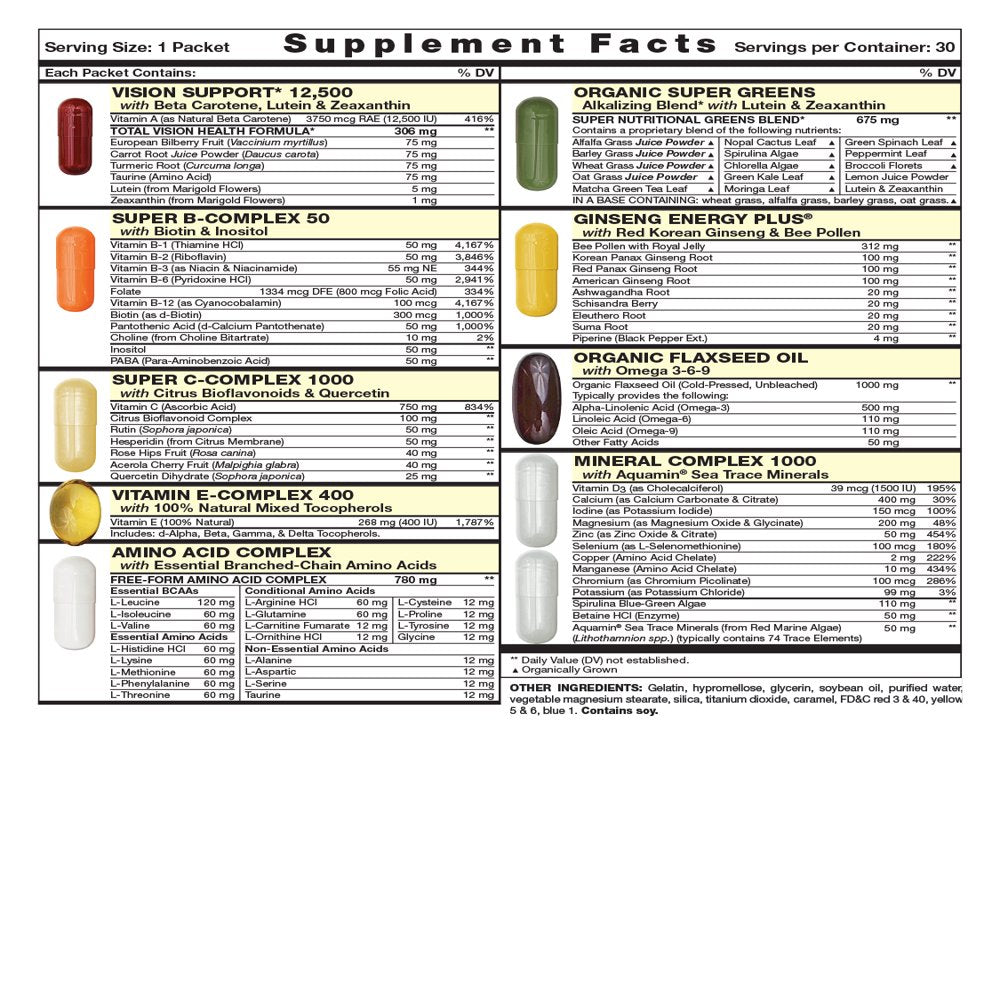- 9 UNIQUE SUPPLEMENTS – Each packet contains Vision Support 12,500, Super B-Complex 50, Super C-Complex 1000, Vitamin E-Complex 400, Amino Acid Complex, Organic Super Greens, Ginseng Energy Plus, Organic Flaxseed Oil, Mineral Complex 1000.