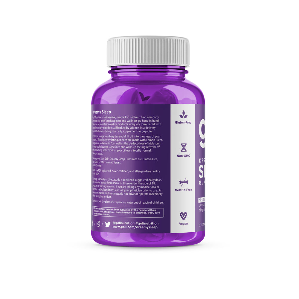 - Made with local and globally sourced ingredients: Goli® Dreamy Sleep Gummies are made in allergen-free, cGMP certified facilities in the United States from premium local and globally sourced ingredients to ensure our products are reputable and of the highest quality standards.