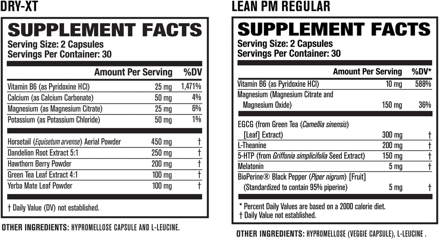 - AM/PM Thermo Stack: Burn XT Thermogenic Fat Burner, Lean PM Night Time Fat Burner & Sleep Aid, Lean XT Caffeine Free Weight Loss Supplement, Dry XT Water Weight Loss, Yohimbine Thermogenic Stimulant.