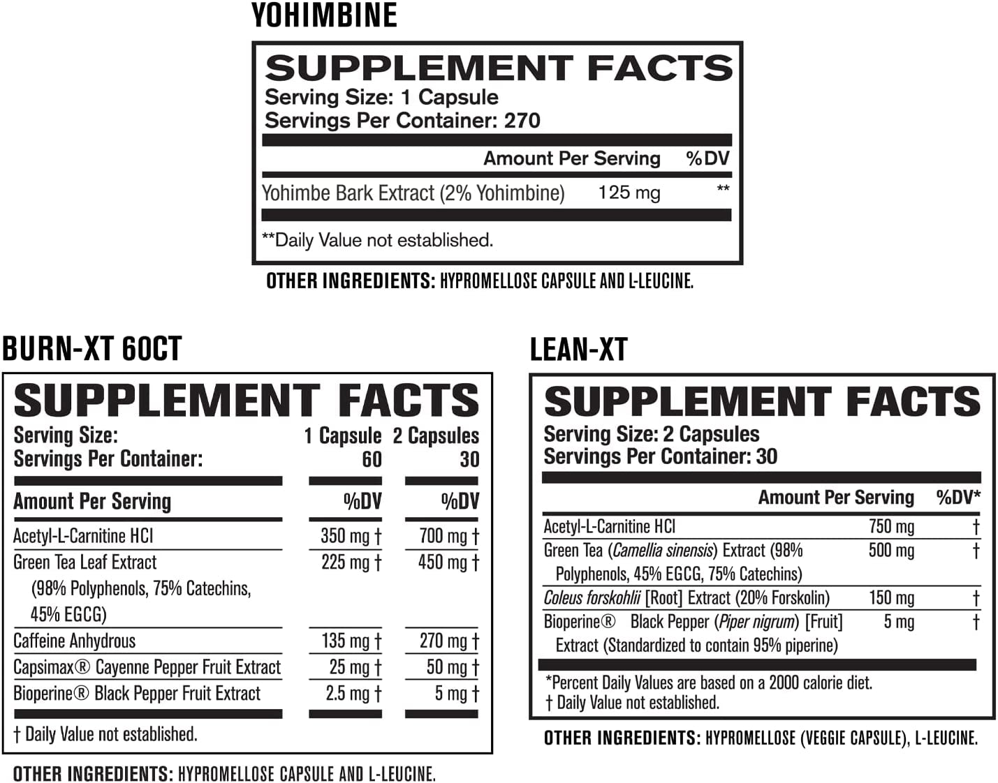 Weight Loss SupportLet’s be honest: no weight-loss supplement will magically get rid of belly fat overnight. But with the right diet and training plan in place, a properly formulated fat burner bundle can help support a healthy lifestyle and weight loss journey. The keyword being “support”: this bundle won’t do all the hard work for you, but it will help you make the most of your hard work! | Maximize the BurnFor best results, use products from this bundle for 60 days in combination with a healthy diet and exercise program. Drink plenty of water daily to avoid dehydration and never take Burn-XT on an empty stomach. Read instructions carefully. | Research-Backed IngredientsThis bundle uses premium natural ingredients, efficacious doses, total label transparency, and contains no artificial fillers, preservatives, or food dyes. Each bottle of Burn-XT, Lean PM, Lean-XT and Yohimbine is manufactured in a cGMP manufacturing facility in the USA, adhering to the most stringent manufacturing standards. |