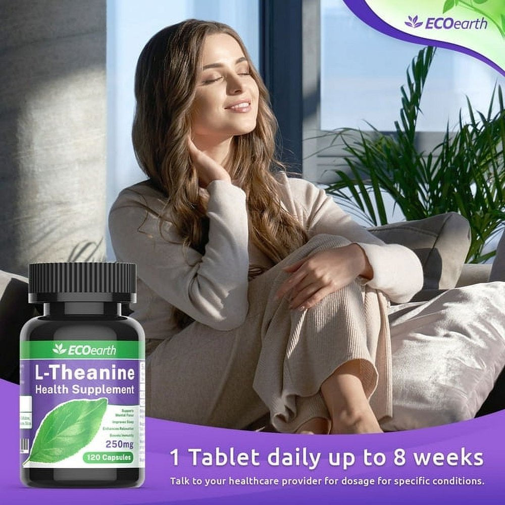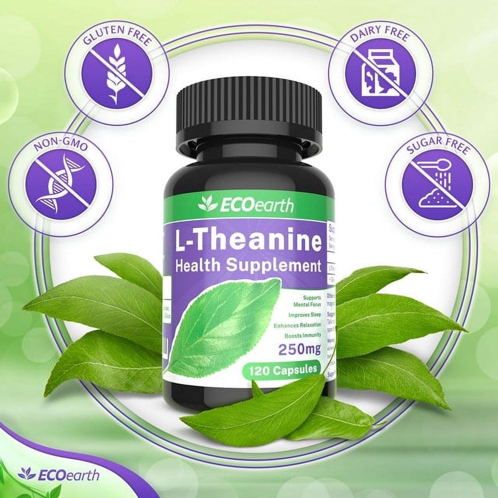L-Theanine 250 Mg 120 Capsules, Supplement Support for Anxiety, Focus, Sleep by Ecoearth