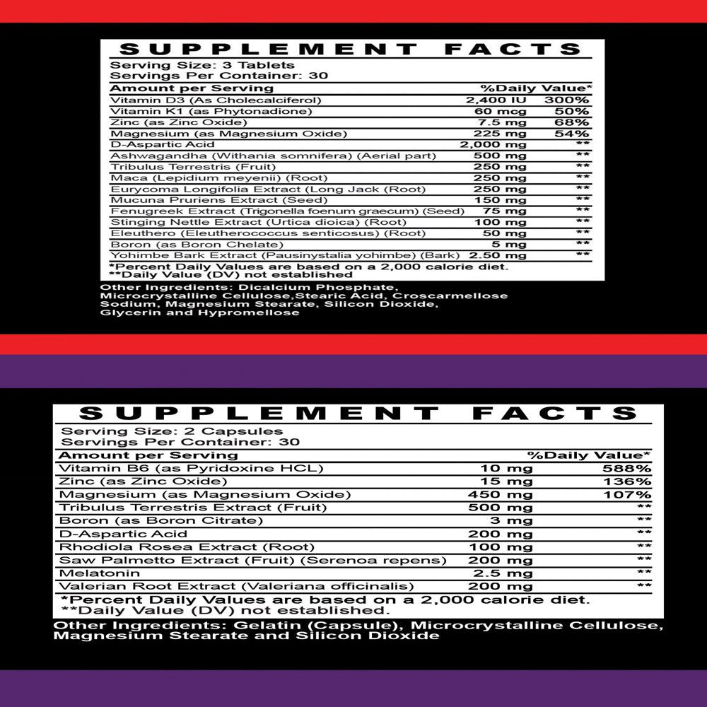 Monster Test Maxx:Monster Test testosterone booster includes Zinc which supports normal protein synthesis, maintenance of normal bones and metabolism of fatty acids. The vitamin B6 contributes to normal protein and glycogen metabolism. Each ingredient fulfills a role in giving you the results you want fast.Monster PM:The 500 mg of Tribulus Terrestris stored in each one of these capsules give you back your youthful Stamina & Vitality.