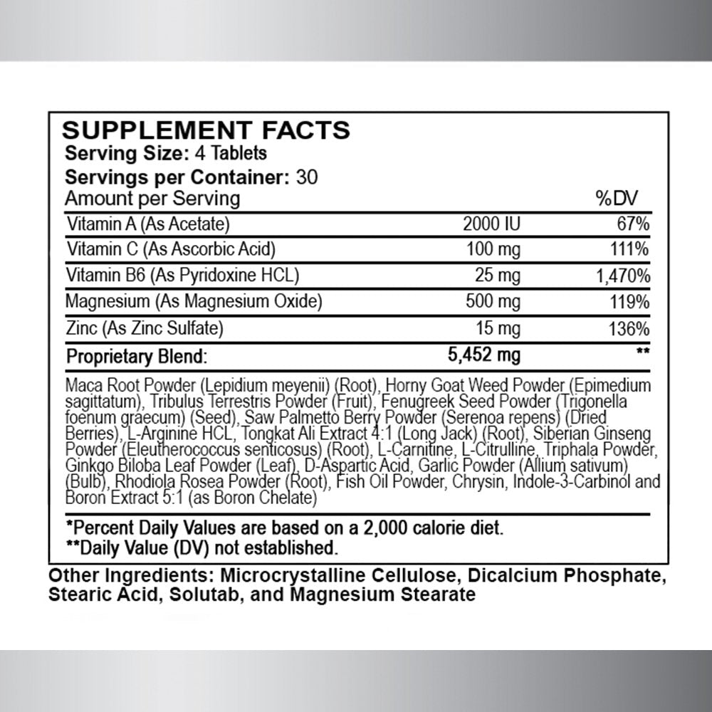 Monster Test:Bottle Count: 120 Count / 1 Month SupplyCapsule: Bovine (cow) basedMain Ingredients: Vitamin A, Zinc, Vitamin B6, Magnesium, Vitamin C, Maca Extract, Tribulus Terrestris Extract, AminosMain Use: Our Monster Test formula increases muscle mass, energy levels, libido and bone density.Suggested Use: As a dietary supplement, take one serving four (4) tablets in the morning with breakfast. For best results use for eight weeks.Angry Energy:Bottle Count: 60 Count / 1 Month SupplyCapsule: Bovine (cow) basedMain Ingredients: Caffeine, Garcinia Cambogia, Apple Cider Vinegar, Ginseng, Guarana, Cayenne Pepper, Yerba MateMain Use: Provides long lasting energy without harsh side effects and chemicals.Suggested Use: Take one serving, two (2) Capsules once daily, pre or post-workout, not to exceed one serving in 24 hours. If you are sensitive to caffeine, try taking with a small amount of food and do not take within 6 hours of bed-time. The recommended dose of this product has as much caffeine as a cup of coffee.Monster Test Extreme Nitric Oxide Boost:Bottle Count: 60 Count / 1 Month SupplyCapsule: Bovine (cow) basedMain Ingredients: Beta Alanine, L-Citrulline, Vitamin B3, Calcium CarbonateMain Use: Boosts energy, vigor, vitality and circulation.Suggested Use: As a dietary supplement, take one (1) capsule once or twice daily. Preferably with a well-balanced meal and water, or as directed by a healthcare professional.Bottle Count: 60 Count / 1 Month SupplyCapsule: Bovine (cow) basedMain Ingredients: Magnesium, Melatonin, Zinc, Saw Palmetto, Tribulus TerrestrisMain Use: Boosts T-levels, fights feelings of sluggishness and muscle mass reduction, and aids in a restful night of sleep for maximum recovery.Suggested Use: As a dietary supplement, take two (2) capsules daily on an empty stomach 30-60 min. before bedtime. For best results, avoid taking with dairy or other calcium containing foods or supplements. DO NOT EXCEED 2 CAPSULES PER DAY.Monster PMBottle Count: 60 Count / 1 Month SupplyCapsule: Bovine (cow) basedMain Ingredients: Magnesium, Melatonin, Zinc, Saw Palmetto, Tribulus TerrestrisMain Use: Boosts T-levels, fights feelings of sluggishness and muscle mass reduction, and aids in a restful night of sleep for maximum recovery.Suggested Use: As a dietary supplement, take two (2) capsules daily on an empty stomach 30-60 min. before bedtime. For best results, avoid taking with dairy or other calcium containing foods or supplements. DO NOT EXCEED 2 CAPSULES PER DAY.
