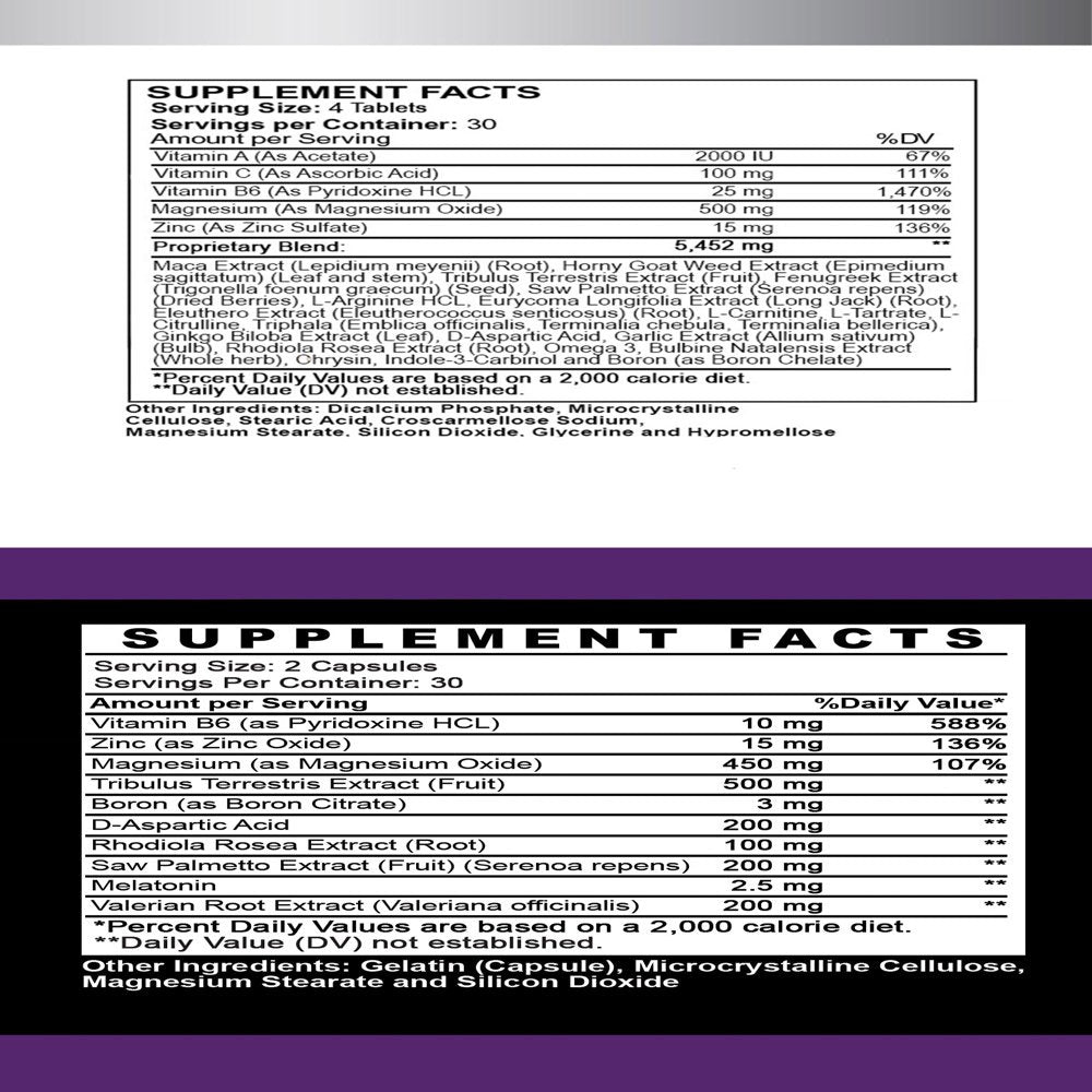 Monster Test:Monster Test testosterone booster includes Zinc which supports normal protein synthesis, maintenance of normal bones and metabolism of fatty acids. The vitamin B6 contributes to normal protein and glycogen metabolism. Each ingredient fulfills a role in giving you the results you want fast.Monster PM:The 500 mg of Tribulus Terrestris stored in each one of these capsules give you back your youthful Stamina & Vitality.