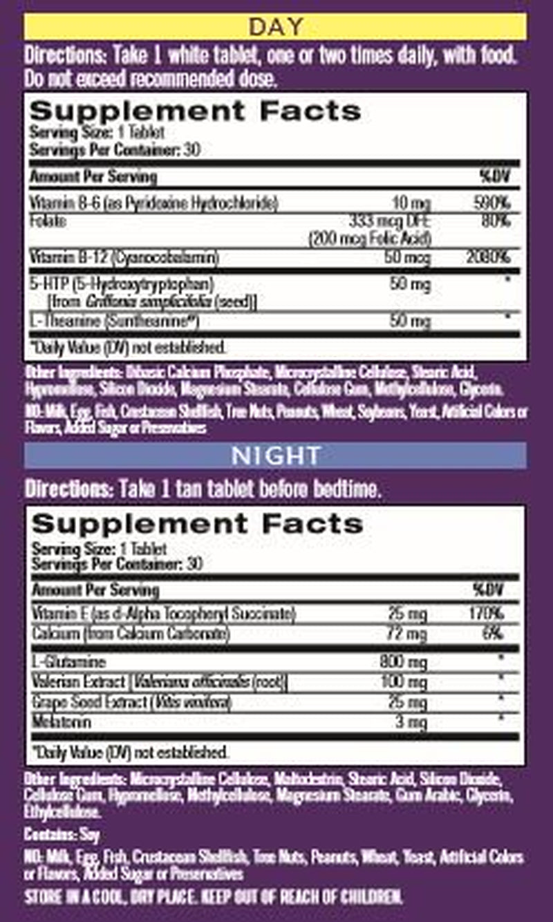 Mood & Stress Value Size Dietary Supplement Vegetarian Day: Promotes Calm & Relaxation Helps Reduce Occasional Anxiety 100% Drug-Free Night: Fall Asleep Faster Stay Asleep Longer 100% Drug-Free Day - Natrol Stress & Anxiety consists of two separate blends to meet your daytime vs. nighttime needs. The daytime formula promotes calm and relaxation during the day. 5-HTP supports serotonin which helps enhance mood. Vitamins B-6, B-12 and Folic Acid help maintain emotional well-being. L-Theanine ensures relaxation without making you drowsy. Night - Natrol Stress & Anxiety consists of two separate blends to meet your daytime vs. nighttime needs. The nighttime formula contains ingredients to promote restorative sleep, helping you wake up refreshed and ready to tackle the day. Melatonin helps you fall asleep faster and stay asleep longer. Antioxidants protect your body from oxidative damage, helping you cope with stress. Melatonin is a nighttime sleep aid for occasional sleeplessness.