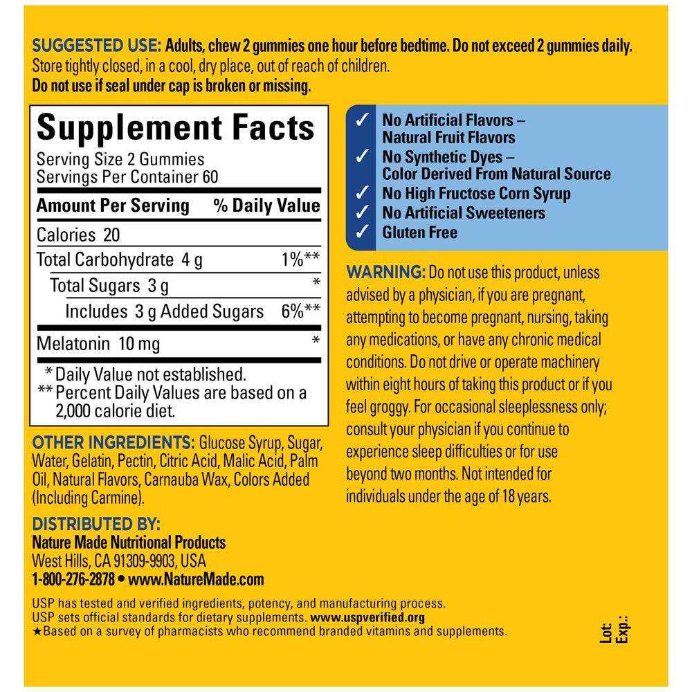 - Nature Made Melatonin 10 mg Gummies per serving is a sleep supplement that helps you fall asleep faster