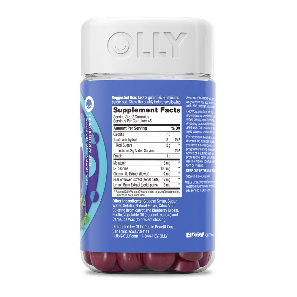 OLLY Extra Strength Sleep gummies for adults deliver a powerful blend of active ingredients that work together to calm your mind and promote restful sleep so you wake up feeling refreshed. These 5mg Melatonin gummies, with L-Theanine and Botanicals like Chamomile and Lemon Balm, work with your body to help you fall asleep and stay asleep.*Naturally flavored with Blackberry and a hint of mint, Sleep gummy vitamins help you drift off. They're naturally delicious, scientifically formulated and gluten-free.Good health is at the center of everything we do. That's why we’ve made it our mission to make nutrition easy to understand. We do it by crafting products that are as effective as they are delicious—because we know when something feels good, you’re more likely to do it.**These statements have not been evaluated by the Food and Drug Administration. This product is not intended to diagnose, treat, cure or prevent any disease.For occasional sleeplessness.CAUTION: Melatonin may cause drowsiness or sleepiness; do not take while driving, operating machinery, or engaging in any activity that requires alertness. This product is not intended to treat insomnia or other sleep disorders.