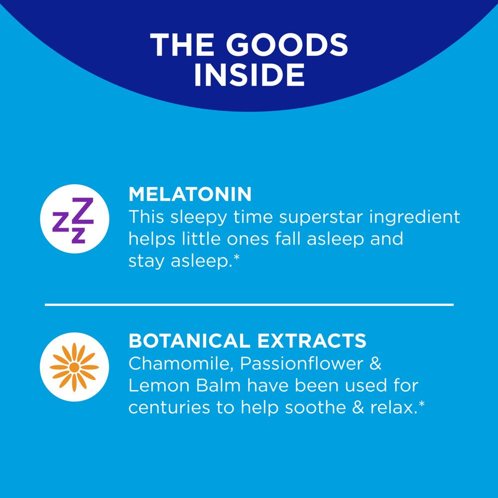 - MELATONIN: This sleepy time superstar ingredient works with your body to help you fall asleep and stay asleep*