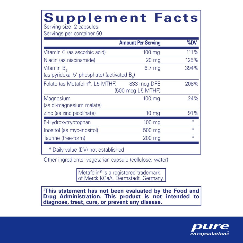 Promotes serotonin synthesis to support relaxation, moderate occasional stress, and maintain healthy eating behavior. Provides the serotonin precursor 5-HTP. Provides inositol, which supports healthy sensitization of serotonin receptors. Supports healthy serotonin activity and maintains healthy reuptake with taurine. Enhances 5-HTP availability with niacinamide and zinc. Includes the cofactors magnesium, vitamin C, vitamin B6 and Metafolin L-5-MTHF to support serotonin production and a positive outlook.