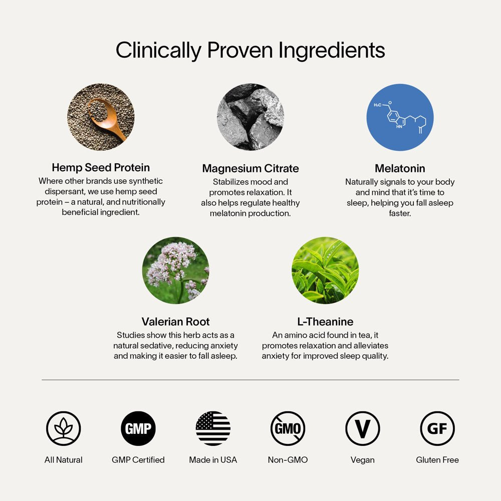 Hemp Seed Protein, Magnesium Citrate, Valerian Root, L-Theanine, Peppermint, Mannitol, Magnesium Stearate, Melatonin, Microcrystalline Cellulose (Plant Derived)/div>