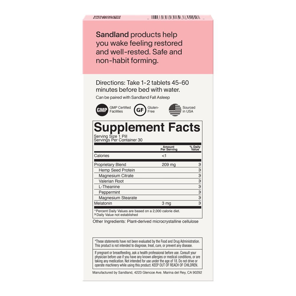 Sleep tight, sleep naturally. Sandland Stay Asleep Plus Melatonin is a time release sleep supplement made with a unique formulation of clean, all natural ingredients to provide healthy, natural rest. Our plant-based formula features peppermint, L-theanine, low dose melatonin and valerian root which promote natural functions in the body to induce a state of relaxation causing you to sleep throughout the night, no unwanted wake-ups or waking up in a fog. Built from the need and desire for a more natural, effective sleep aid, Sandland is creating an entirely new category - one based on the belief that getting great sleep shouldn't be so hard. Our goal is to create more good sleepers. Sleep better, naturally, with Sandland!
