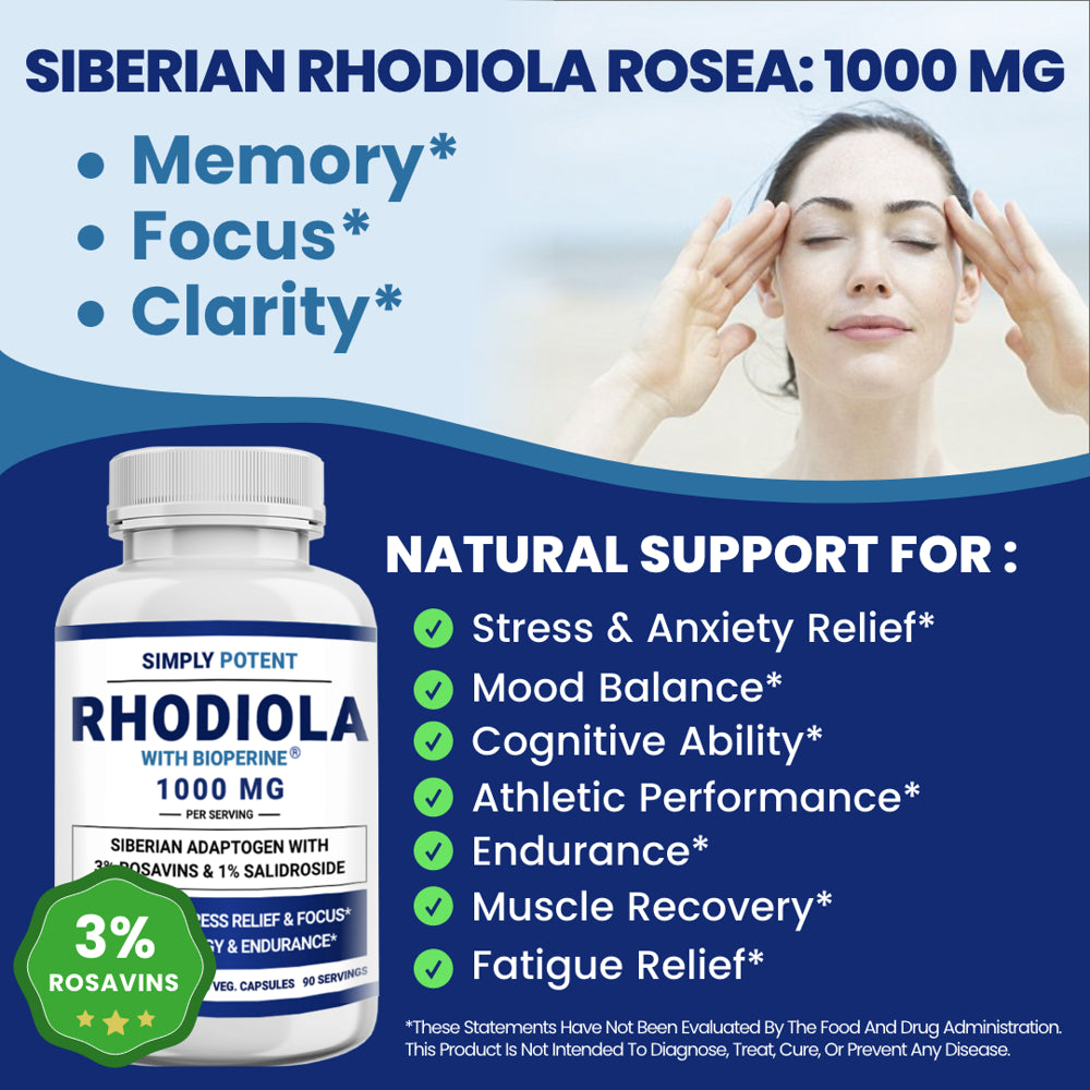 Siberian Rhodiola Rosea Capsules, Max Absorption Rhodiola 1000Mg 180 Pills with 10Mg Bioperine, Rhodiola Root Powder Extract Supplement W 3% Rosavins & 1% Salidroside for Stress Relief, Mood & Energy