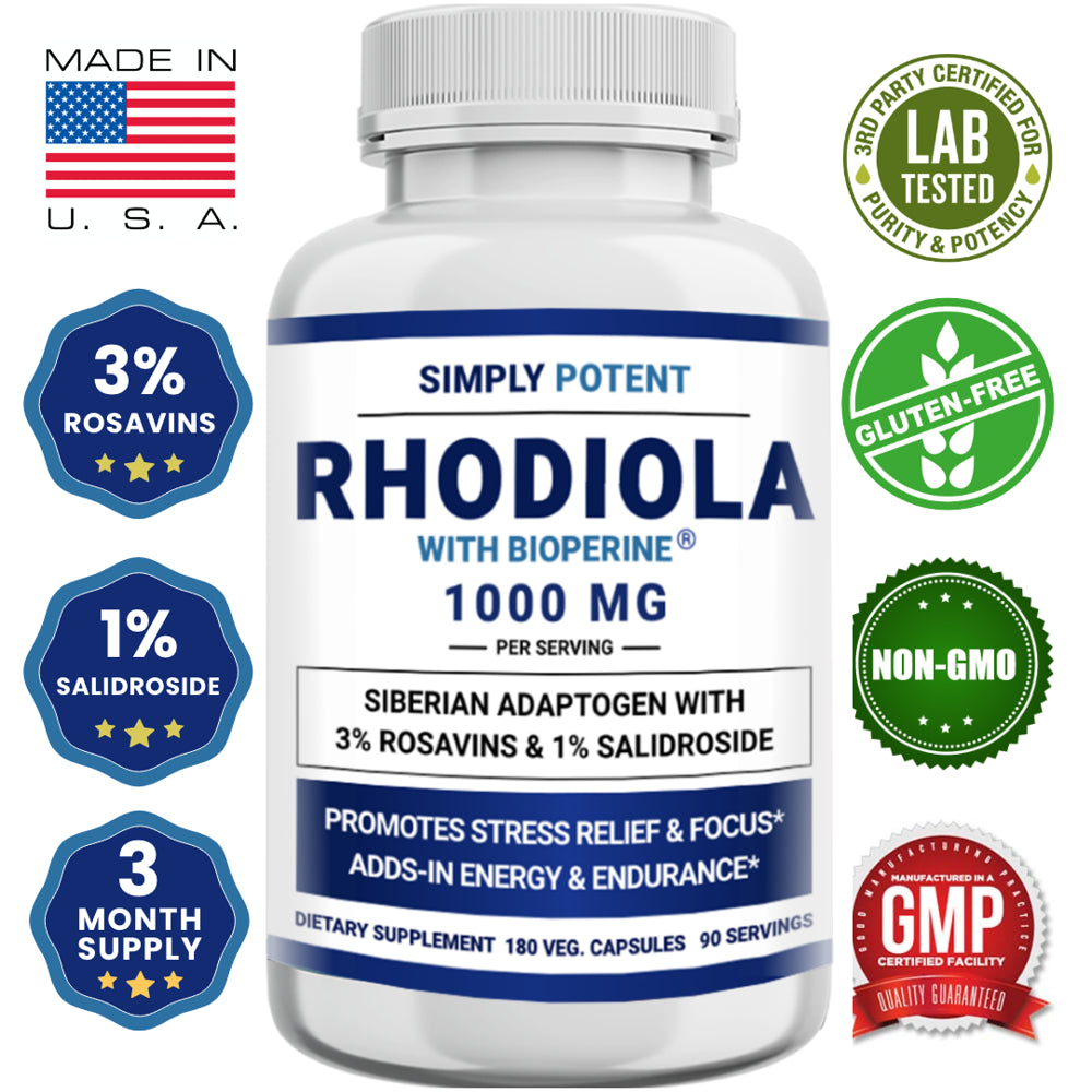 • ★ BIOPERINE ADDED FOR ENHANCED ABSORPTION – BioPerine is known to increase absorption of Rhodiola Rosea by 30 to 55%. With 10 mg of BioPerine, 3% Rosavin, and 1% Salidroside in each serving (2 Capsules), Simply Potent offers you more effective and better absorption & bioavailable Rhodiola supplement support you maintaining or regaining healthy stress level, weight, nerve health, mood, alertness, and energy level.*