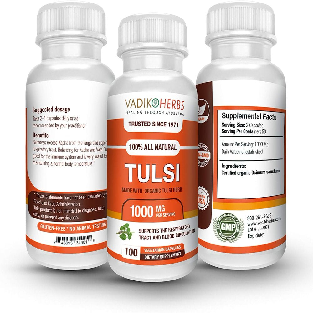 Vadik Herbs Tulsi (Holy Basil) Ultra Potency in a Pure Vegetarian Capsule. 1000 Mg/Dose. Supplement for Fighting Acne, Balances Hormones and Lowers Stress, Best Source of Vitamin K