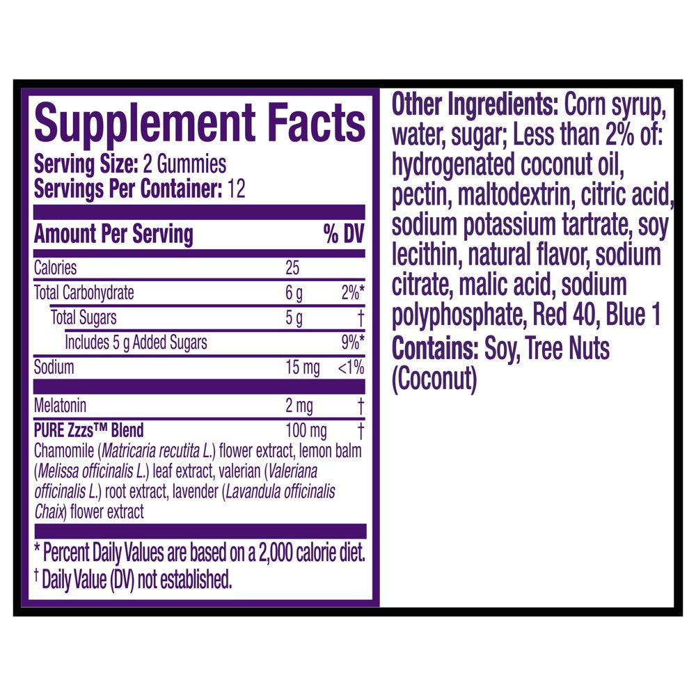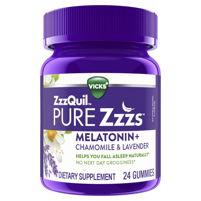 Vicks PURE Zzzs Melatonin Sleep Aid Gummies, 1mg, Dietary Supplement, 24 count work naturally with your body to support your body's natural sleep cycle.* If you've been having occasional sleeplessness , whether it's caused by changes in your schedule, stress or just restless thoughts, consider adding a melatonin sleep aid to your nighttime routine. ZzzQuil PURE Zzzs Melatonin gummies are a great choice when you are dealing with occasional sleeplessness, because they are drug-free and non-habit forming. PURE Zzzs melatonin products are dietary supplements that work naturally with your body to support sleep and are specially formulated with an optimal level of melatonin, shown to help regulate your sleep cycle without next day grogginess*. They also include a complementary blend of botanicals including chamomile, lavender, lemon balm, and valerian root. ZzzQuil PURE Zzzs was developed by the trusted experts at Vicks, because everyone deserves a great night's sleep. ZzzQuil is the World's #1 Sleep Aid Brand!*These statements have not been evaluated by the Food and Drug Administration. This product is not intended to diagnose, treat, cure, or prevent any disease. Source Euromonitor International Limited; Consumer Health 2022 Edition; Sleep Aids, all channels, retail selling price, Global Brand Name ZzzQuil 2021 data