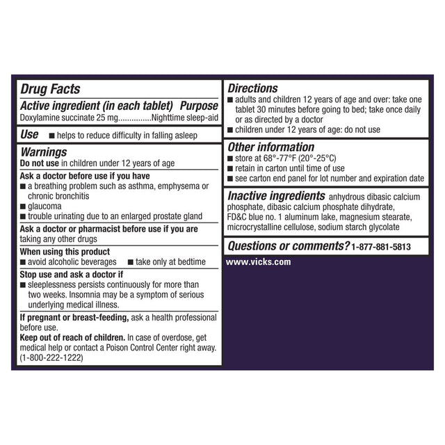 For when you really really need to sleep, try Vicks ZzzQuil Ultra. This sleep aid helps you fall asleep fast and stay asleep longer. ZzzQuil Ultra tablets contain 25 mg of Doxylamine Succinate. Doxylamine works by blocking the histamine receptors in the brain. This action is responsible for the sedative properties of Doxylamine Succinate. In clinical trials it has been shown to help you fall asleep fast, get less interrupted sleep all through the night, and increase duration of sleep by an average of 27%^ This easy to take sleep aid over-the-counter medicine is non-habit forming for a better, more restful sleep all night.^ All ZzzQuil sleep aids are non-habit forming and specifically formulated with clinically proven ingredients by our team of dedicated scientists. ZzzQuil can be used for occasional sleeplessness when you need a little extra help getting to sleep. ZzzQuil is the World’s #1 Sleep Aid Brand!† ^vs. no sleep aid †Source Euromonitor International Limited; Consumer Health 2022 Edition; Sleep Aids, all channels, retail selling price, Global Brand Name ZzzQuil 2021 data. 24 Tablets