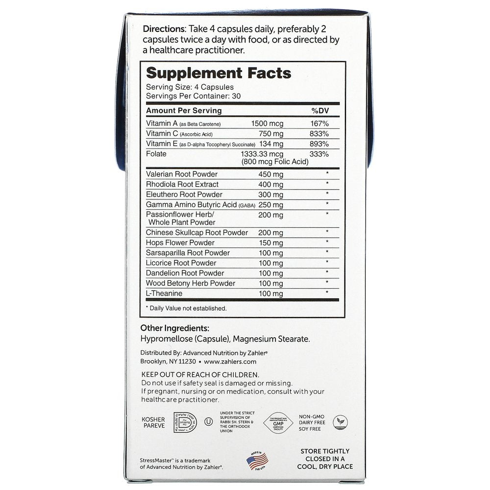 Advanced Nutrition Promotes Relaxation and Calm Support Mind & Spirit Dietary Supplement Kosher Parve This Product is Manufactured in a GMP Certified Facility Non-GMO Dairy Free Soy Free Vegetarian Feel Better, Everyday™ Zahler StressMaster™ is a comprehensive formula including Valerian Root, Rhodiola Root, Passionflower and more. This formula is designed to support calmness and promote relaxation. What's Included: Passionflower Dandelion Root Licorice Root Valerian Root