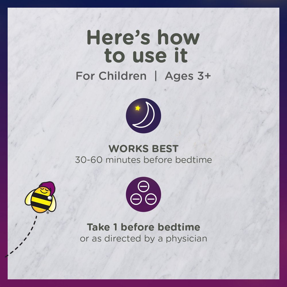 Zarbees Kid’s Sleep Gummies with Melatonin contain 1 mg of clinically studied melatonin to help promote peaceful sleep in kids ages 3+.* This safe & effective gummy will help with your child’s occasional sleeplessness.* Sweetened with honey & other natural flavors, our drug-free, easy-to-chew, non-habit-forming supplement works naturally with the body's sleep rhythm to safely & effectively help guide your child to sleep.* Melatonin is a hormone the brain produces to help regulate sleep & wake cycles. These delicious, natural berry flavor gummies are made from carefully selected ingredients inspired by nature - free of drugs, alcohol, artificial sweeteners, high fructose corn syrup, & gluten. Zarbee’s is the #1 Pediatrician Recommended Sleep Support Brand for Children. *For occasional sleeplessness. *These statements have not been evaluated by the Food and Drug Administration. This product is not intended to diagnose, treat, cure, or prevent any disease.