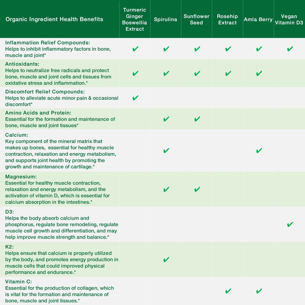 - 5-IN-1 SUPREME FORMULA: 2 Tablets Daily Provides Comprehensive Long-Term Support for Bone, Muscle, and Joint Health Plus Daily Relief from Inflammation and Discomfort. Contains a Potent Combination of Beneficial USDA Certified Organic Herbal Extracts, Magnesium Glycinate, Calcium, Antioxidants, Proteins, Essential Amino Acids, Plus Vitamins D3, K2-MK7, and C.