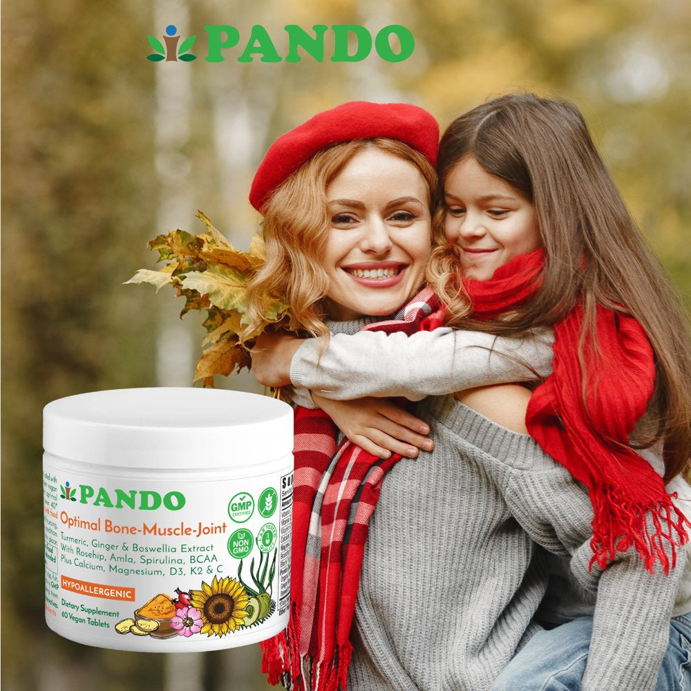 PANDO Optimal Bone-Muscle-Joint is a Vegan 5-in-1 Supplement that Supports your Comprehensive Long-Term Bone, Muscle, and Joint Health Plus Daily Relief from Inflammation and Discomfort. Contains a Potent Combination of Highly Beneficial USDA Certified Organic Herbal Extracts, Magnesium Glycinate, Calcium, Antioxidants, Proteins, Essential Amino Acids, Plus Vitamins D3, K2-MK7, and C.
