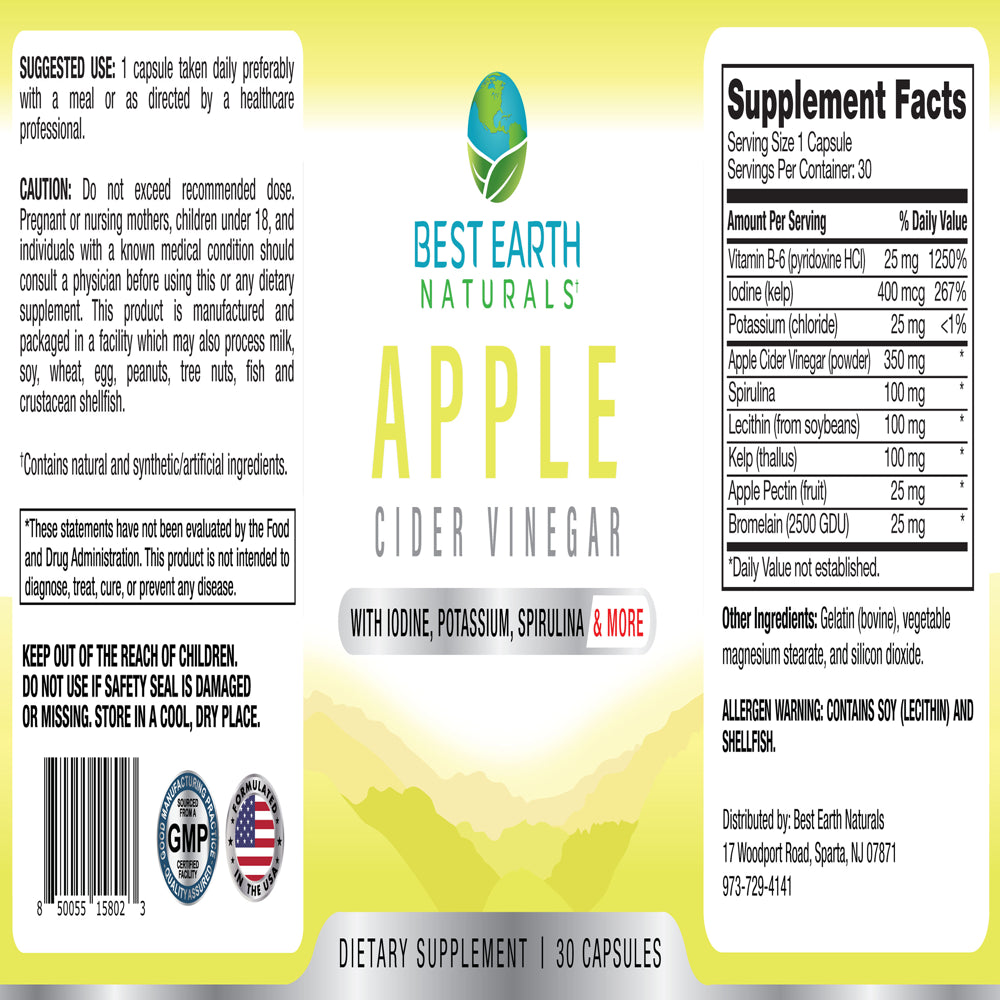 - Our formula includes apple cider vinegar, vitamin B-6, iodine from kelp, potassium, spirulina, lecithin, kelp, apple pectin, and bromelain.