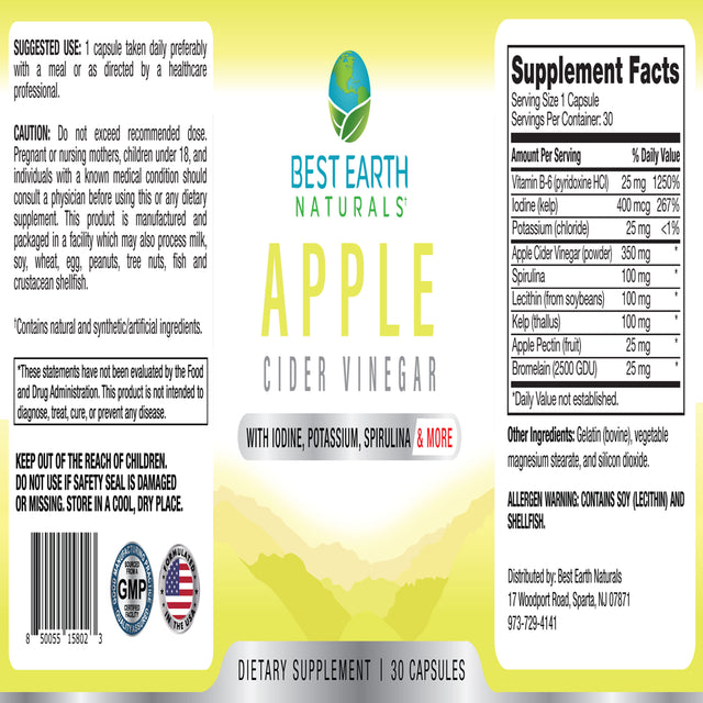 Best Earth Naturals, Apple Cider Vinegar Complex with Iodine Potassium Spirulina and More, 30 Count