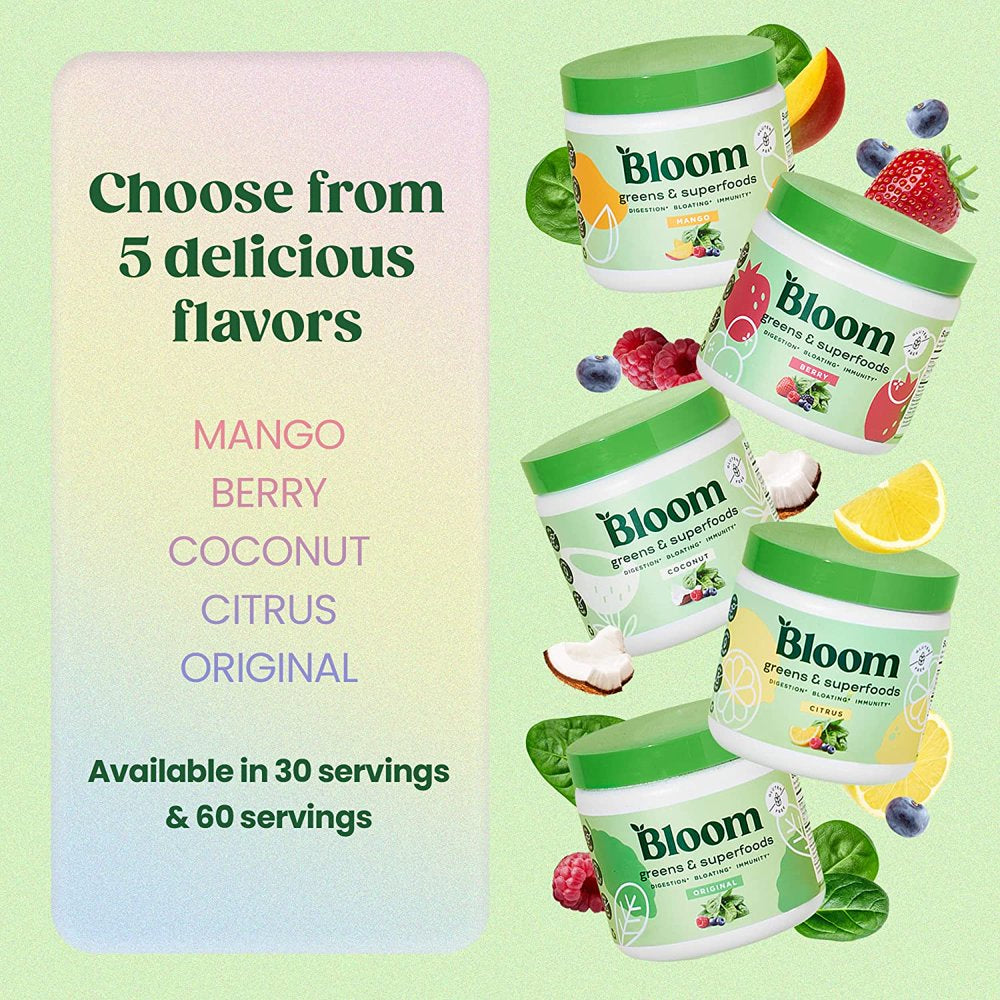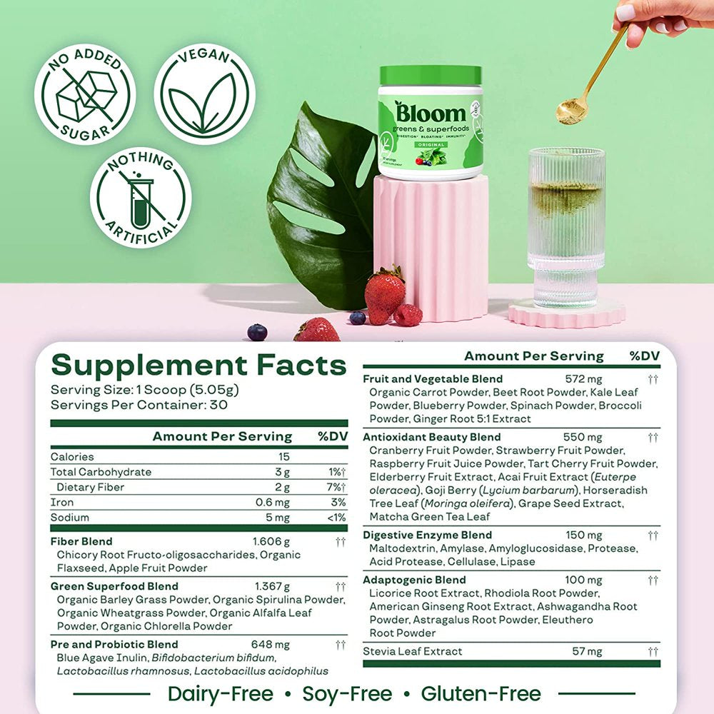 • 30+ Nutrients in 1 Scoop: Bloom Nutrition Greens & Superfoods Powder is a tasty daily dose of greens made with 30+ nutrients including organic fruits and vegetables, probiotics, antioxidants, and more. Whether you're dealing with bloating, the morning after a night out, or wanting to improve your general health, Bloom Greens are amazing for anyone looking to add more vitamins and minerals to their diet. Serving size 1 scoop, 30 servings per tub.