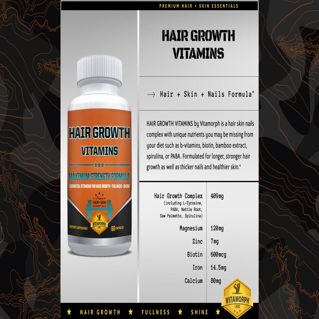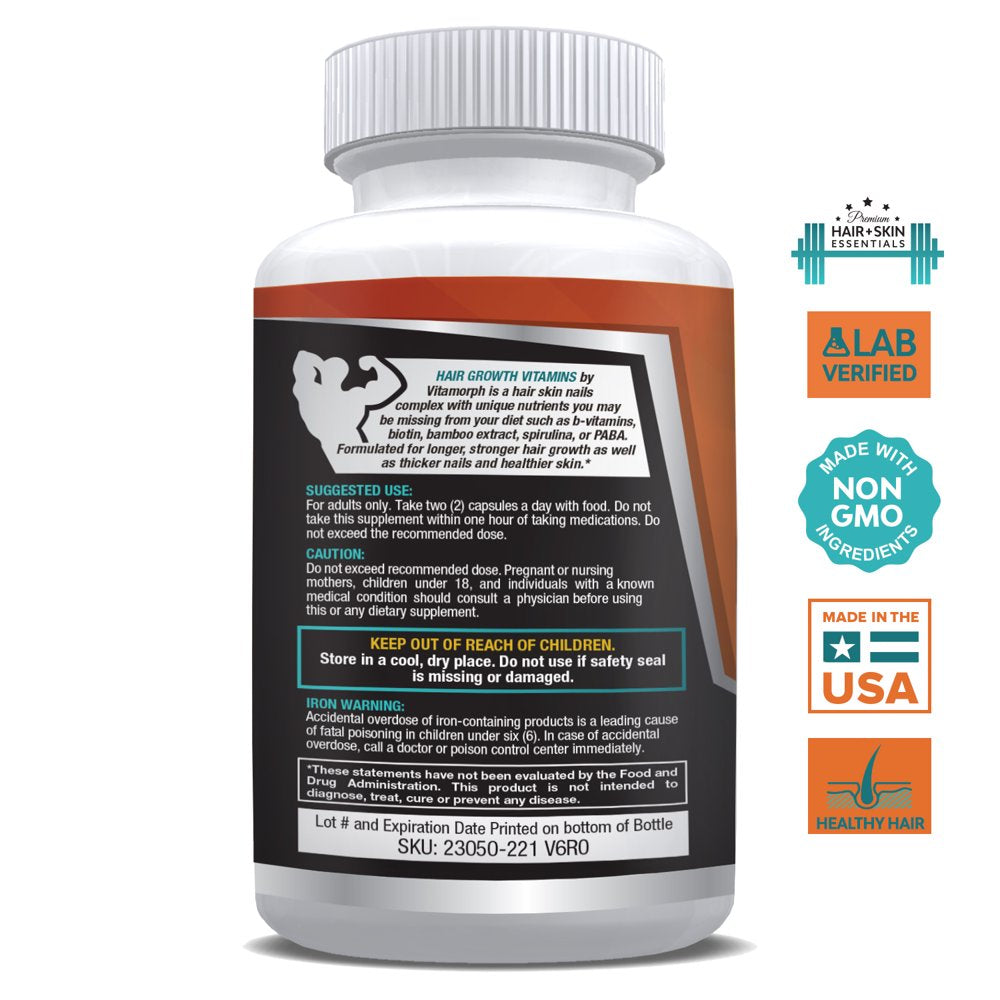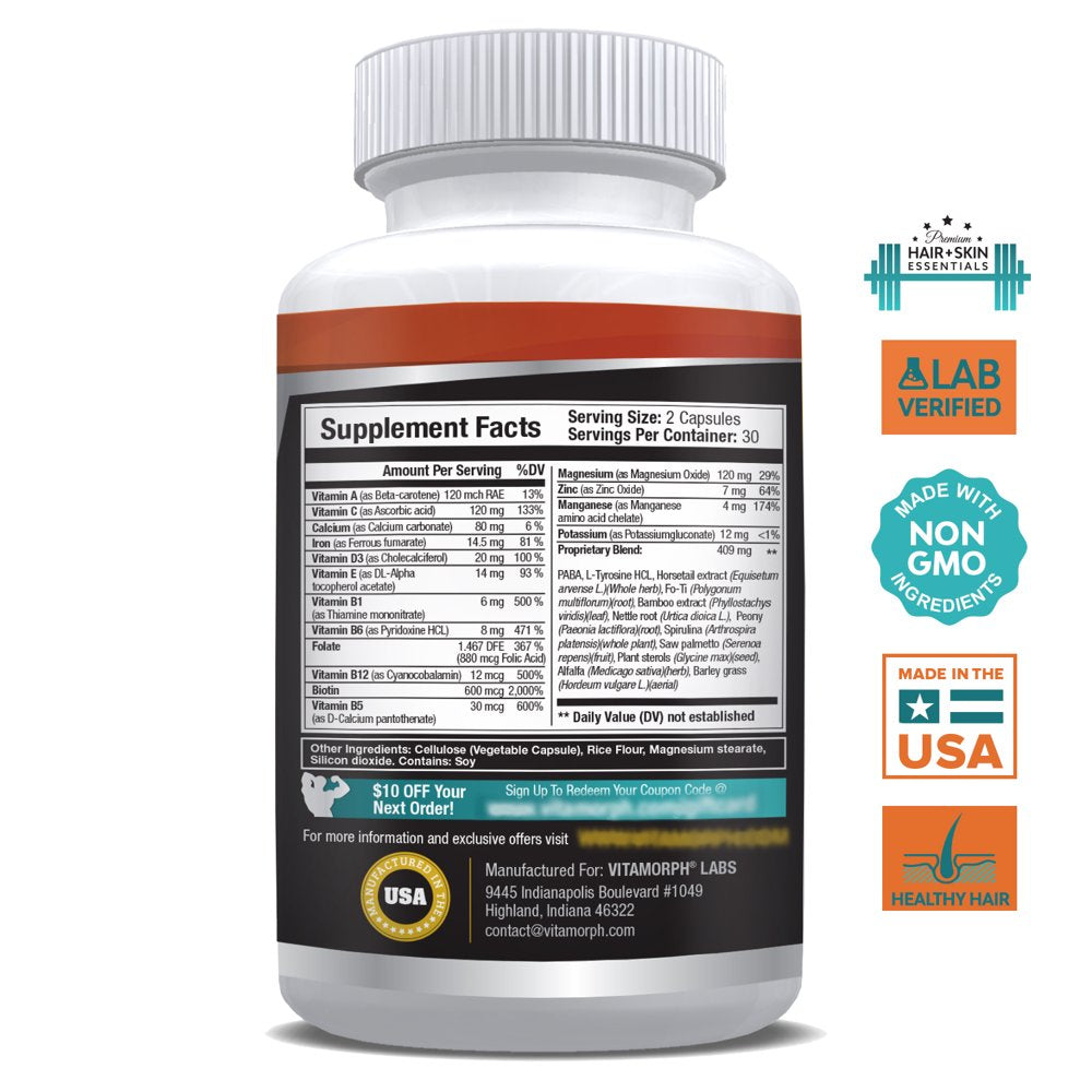 - NUMEROUS HAIR GROWTH VITAMINS - Hair Growth Vitamins by Vitamorph Labs contains a multitude of ingredients supporting hair growth including vitamin a, c, d3, biotin, iron, calcium, folate, zinc, manganese, magnesium, potassium, paba, l-tyrosine HCl, horsetail extract, fo-ti, bamboo extract, nettle root, peony, spirulina, saw palmetto, plant sterols, alfalfa, barley grass and more!