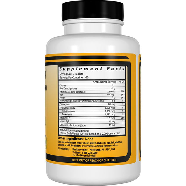Healthy Origins Organic Non-GMO Spirulina 500 mg. - 180 Tablet(s) Healthy Origins Organic Spirulina 500 mg. naturally contains over 60% protein and is a great source of many important phytonutrients and minerals such as carotenoids, essential fatty acids, iron, magnesium, calcium and selenium. Spirulina is a fresh water blue-green algae that delivers one of the most complete nutrient profiles found in nature.