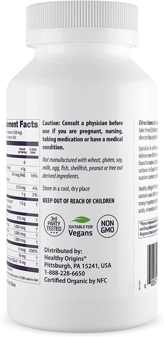 Healthy Origins Organic Spirulina 500 Mg (Organic Certified, Kosher Certified, Natural, Non-Gmo, Gluten Free, Vegan Superfood), 720 Tablets