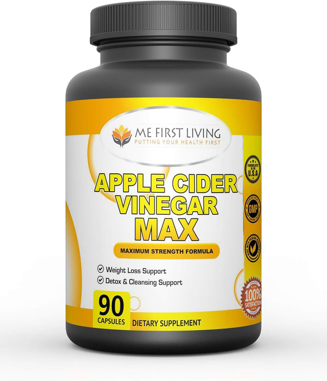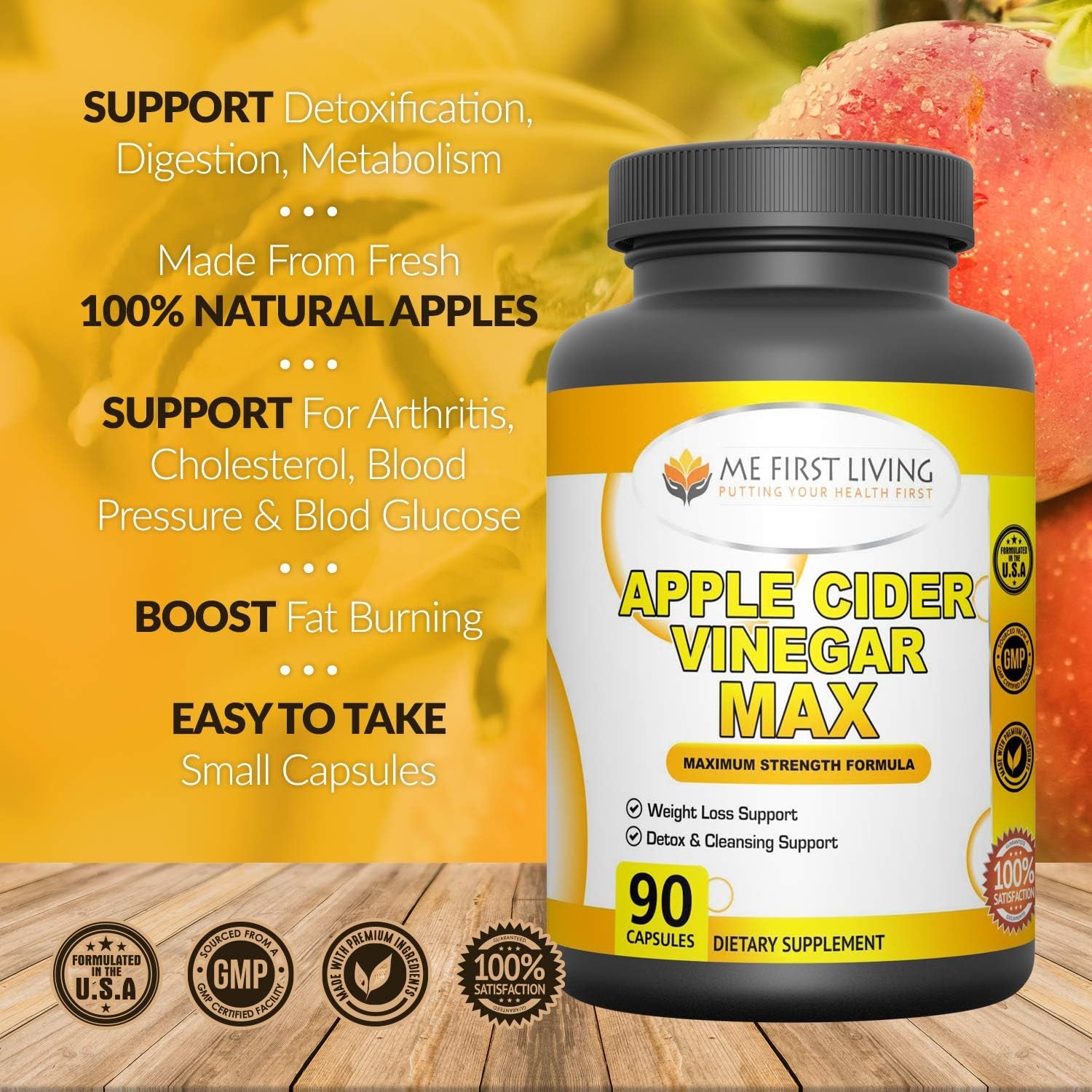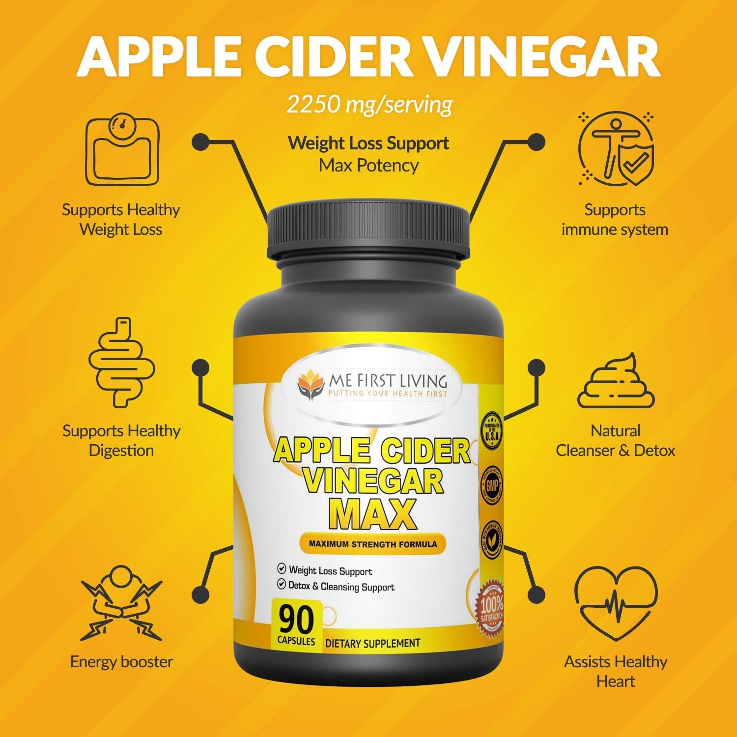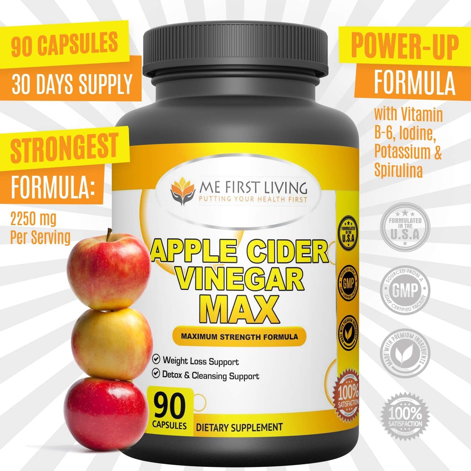 - The Formula | Me First Living Apple Cider Vinegar Max will give you all of the benefits of drinking ACV in an easy to swallow and convenient capsule, leaving out the harsh taste. We take our formula a step further by providing you with some essentials that pair tremendously well with Apple Cider Vinegar. This includes some vital ingredients like Spirulina, Lecithin, Kelp, Apple Pectin, Bromelain, Potassium and Vitamin B-6.
