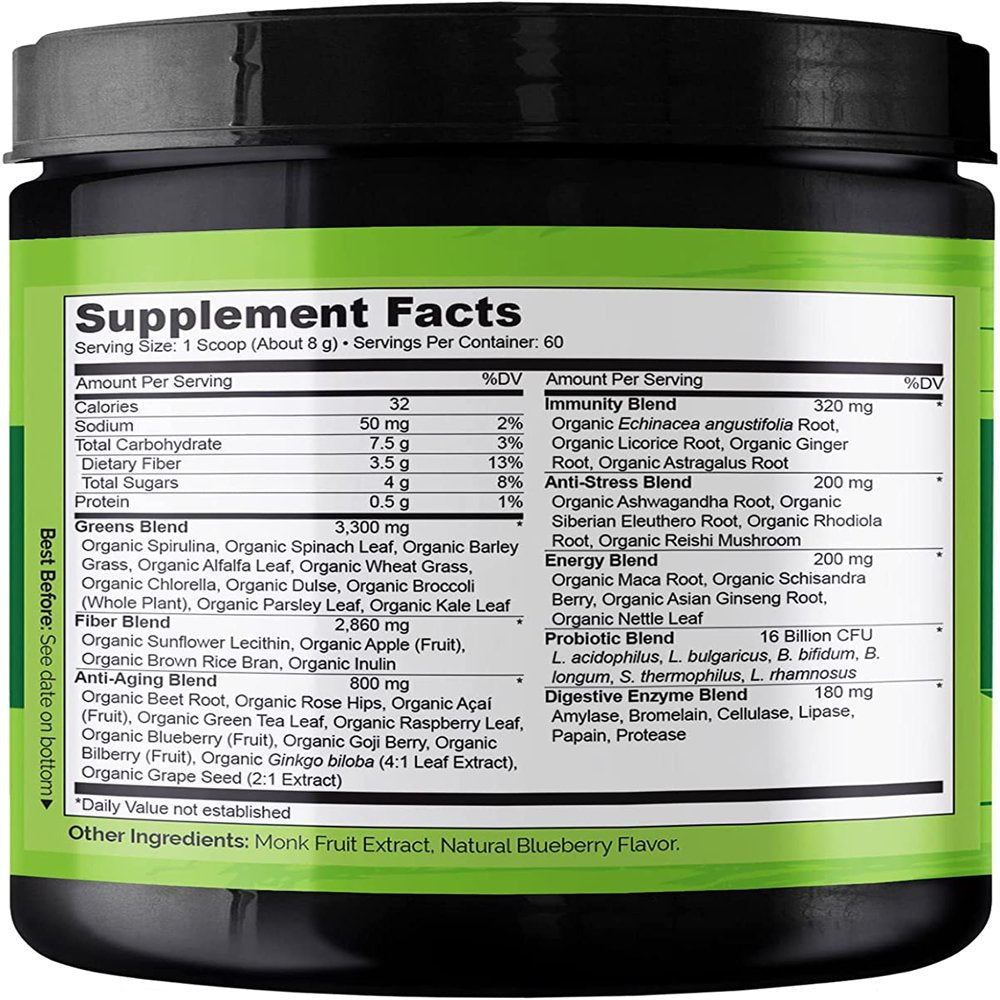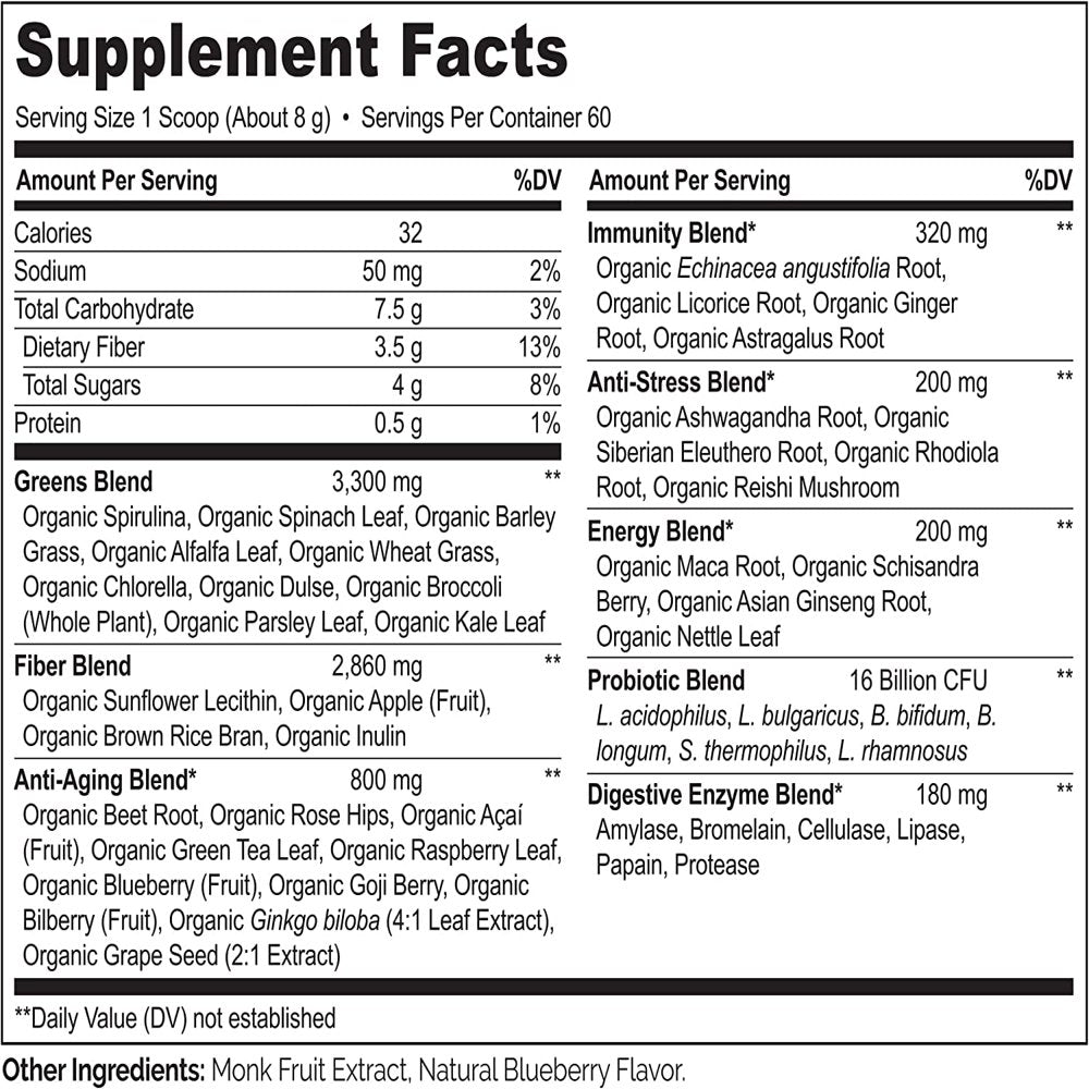 • Organic Superfood Blend: Made with nutrient-packed organic whole foods, including raw greens like spirulina, barley grass, alfalfa, wheat grass, chlorella, kale, spinach, and broccoli, and fruits like acai, blueberry, and goji berries.